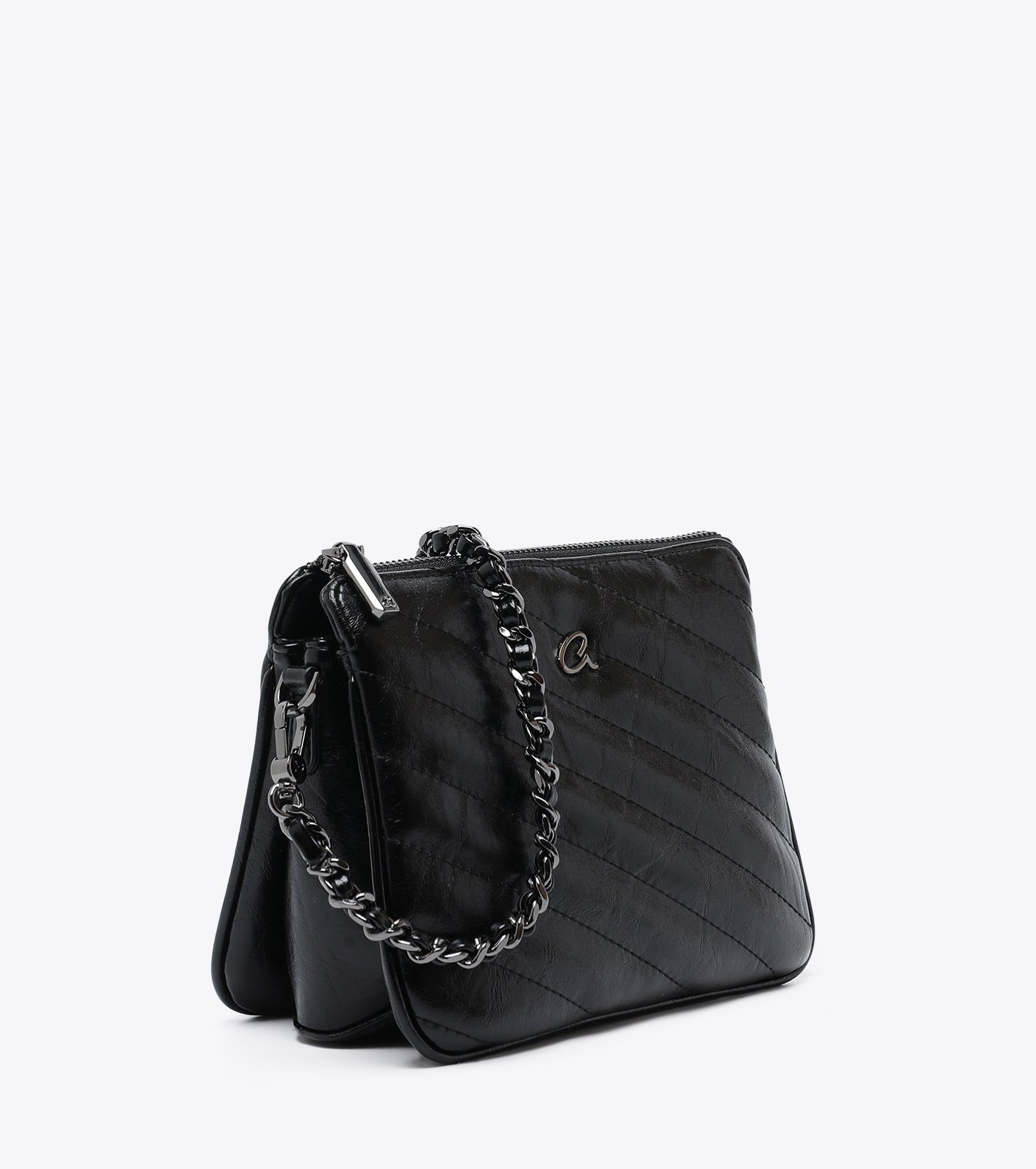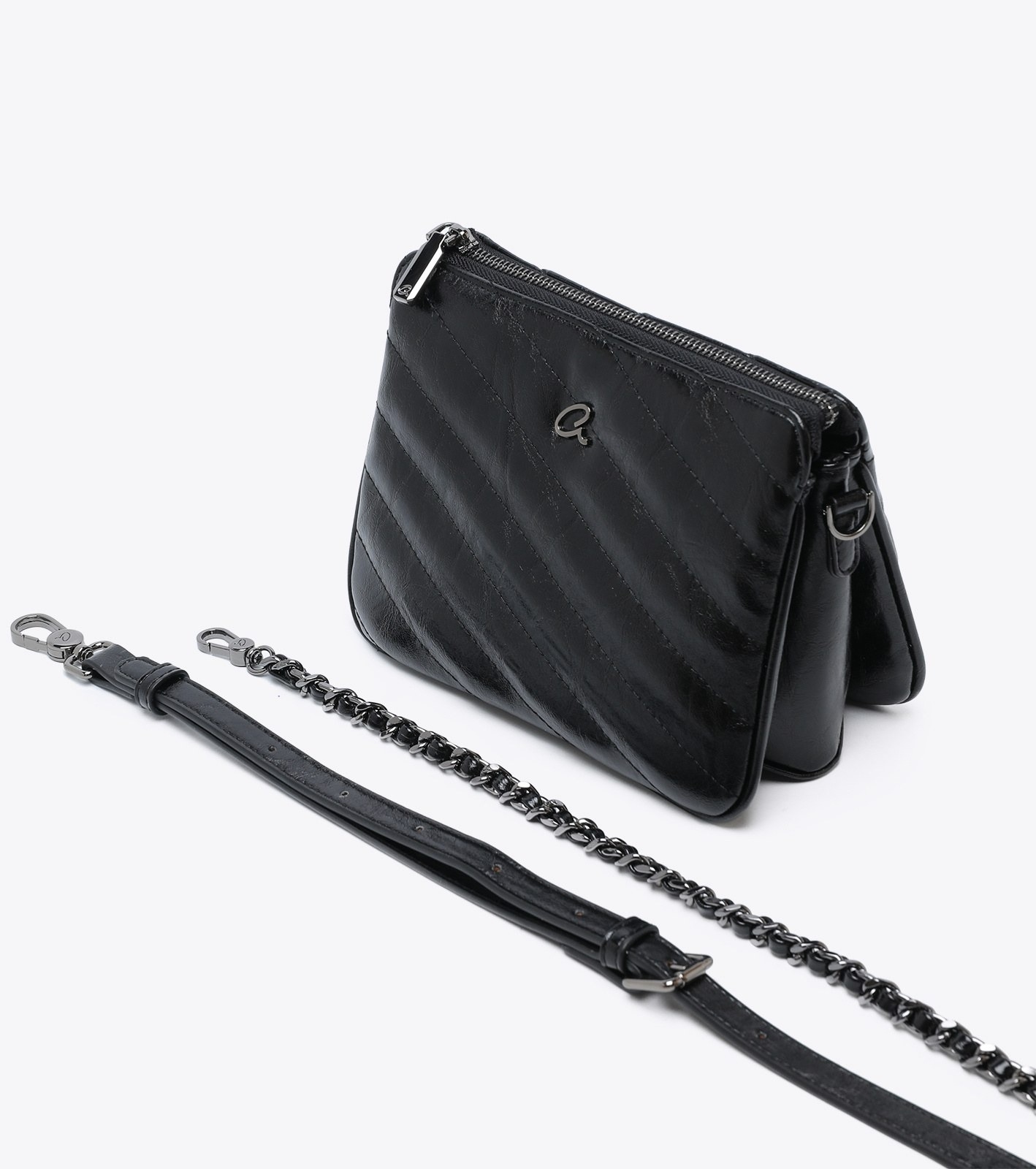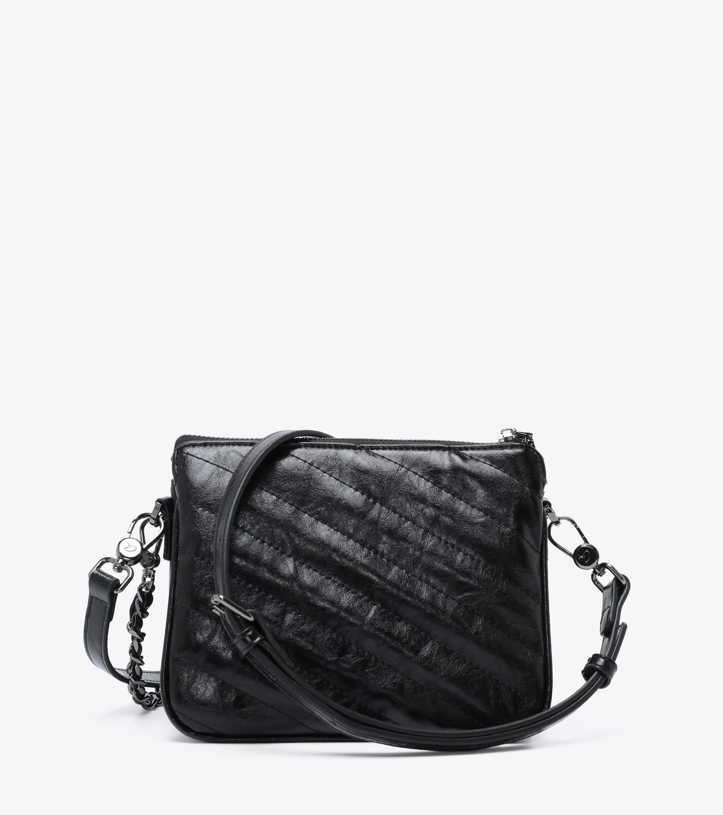 Γυναικεία τσάντα χιαστί Valeria, κατασκευασμένη από τεχνόδερμα με ραφές. Διαθέτει μεταλλικές λεπτομέρειες σε gun απόχρωση και κλείσιμο με φερμουάρ. Συνοδεύεται από δύο αποσπώμενα λουράκια, ένα χιαστί που μπορεί να ρυθμιστεί και ένα με αλυσίδα για να φορεθεί και ως ώμου. Διαχωρίσμένο σε τρία τμήματα εσωτερικά για ευκολία στην οργάνωση. Ιδανικο για κάθε μέρα.