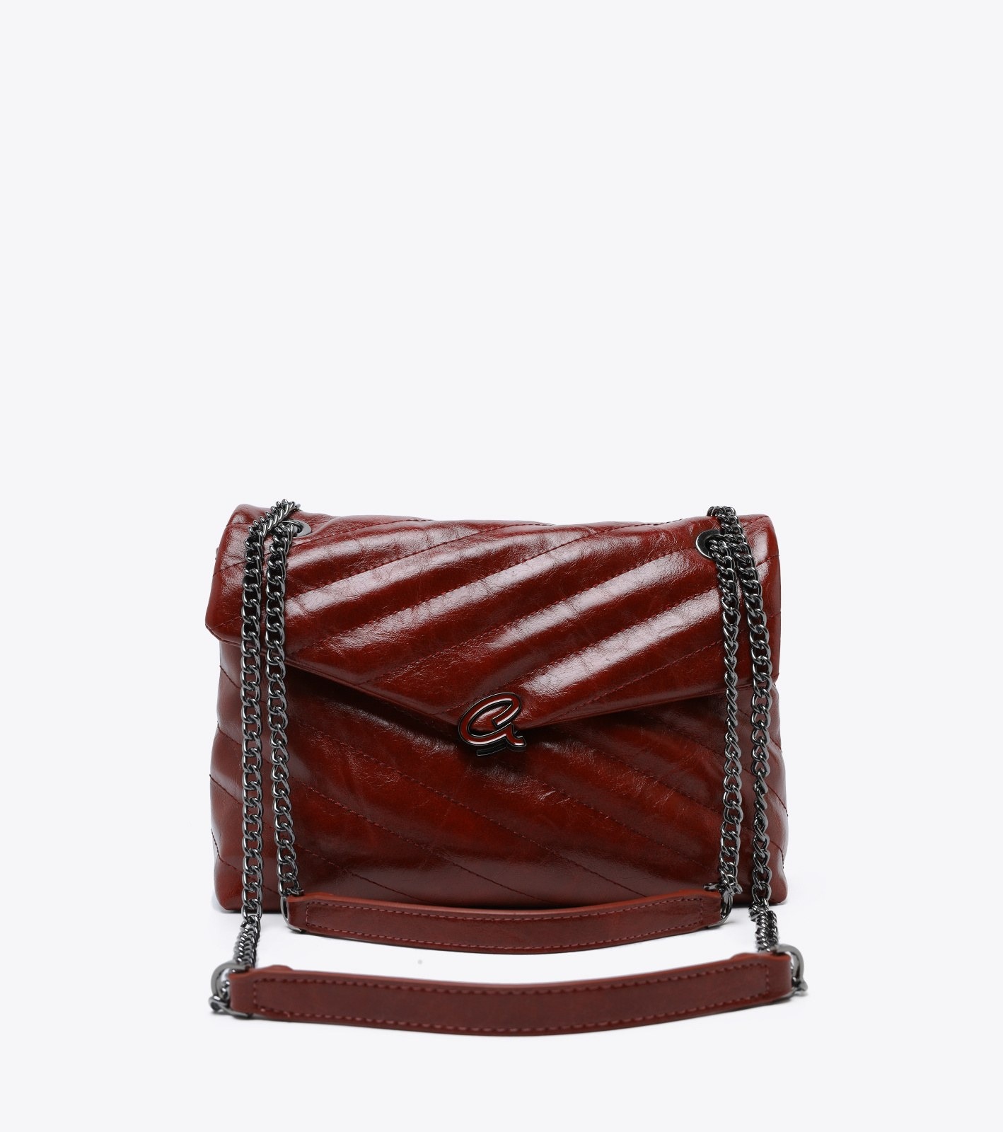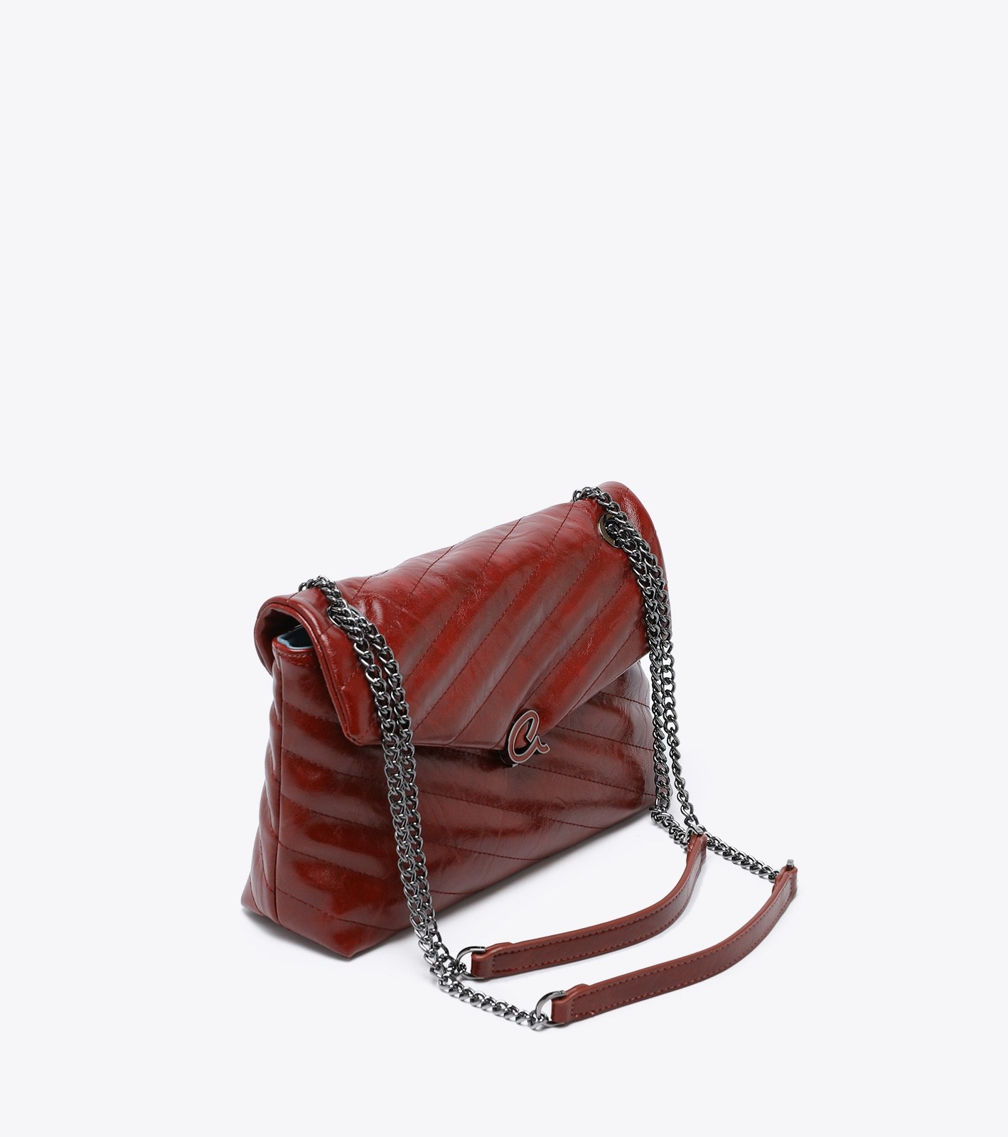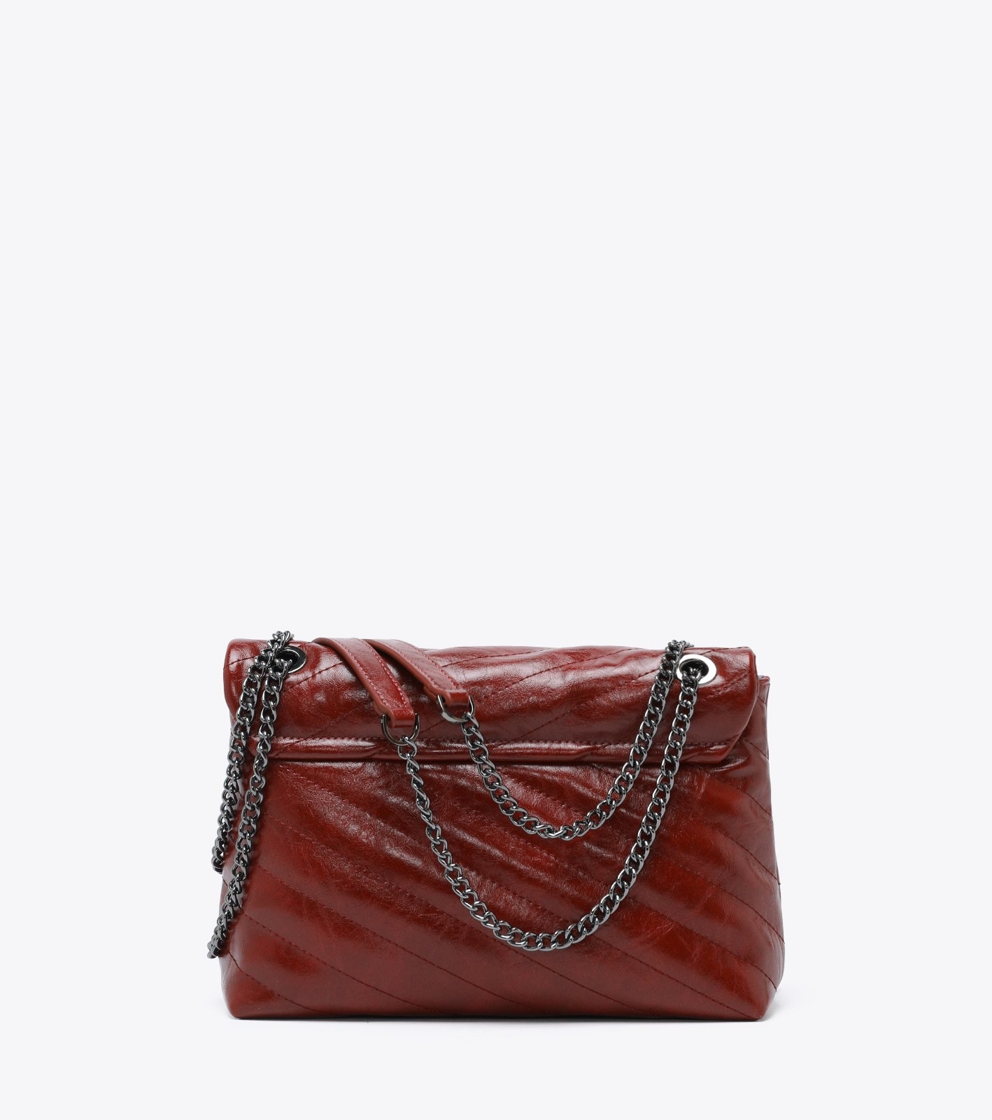 Γυναικεία τσάντα ώμου Valeria με διπλή αλυσίδα. Είναι κατασκευασμένη από τεχνόδερμα με ραφές και φέρει απαλή καπιτονέ όψη. Ασφαλίζει με ιδιαίτερο μεταλλικό στοιχείο σε σχήμα ‘a’ και εσωτερικά διαθέτει ανοιχτή θήκη για κινητό. Η αλυσίδα διαθέτει τμήματα από τεχνόδερμα στο σημείο του ώμου για άνεση στη μετακίνηση, και μπορεί να προσαρμοστεί ώστε να φορεθεί και ως χιαστί. Σε κλασικό πατρόν με μοντέρνα όψη, ιδανική για να συνοδέψει σε κάθε έξοδο.