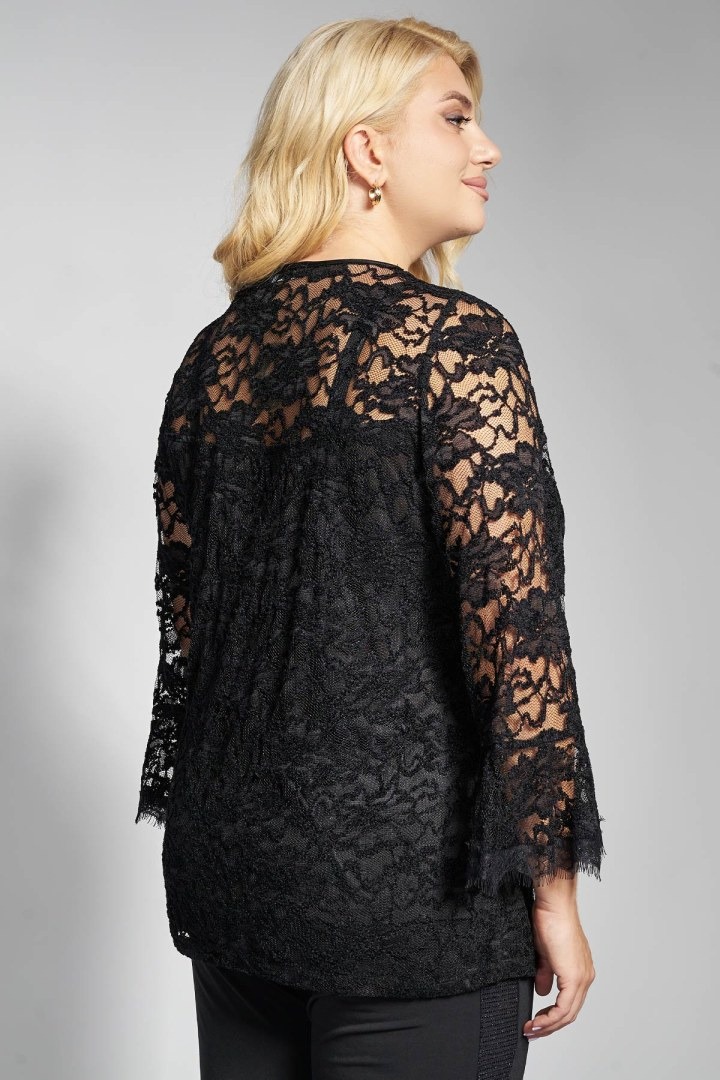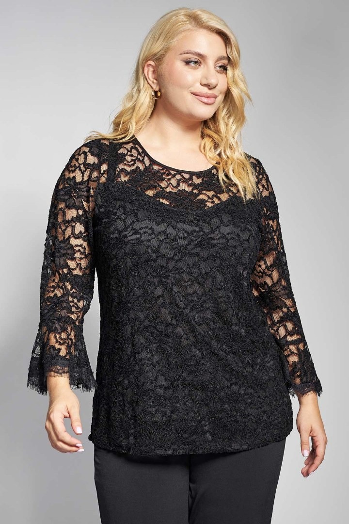 Mπλούζα από πλούσια δαντέλα με στρογγυλή λαιμόκοψη και μακριά μανίκια καμπάνα