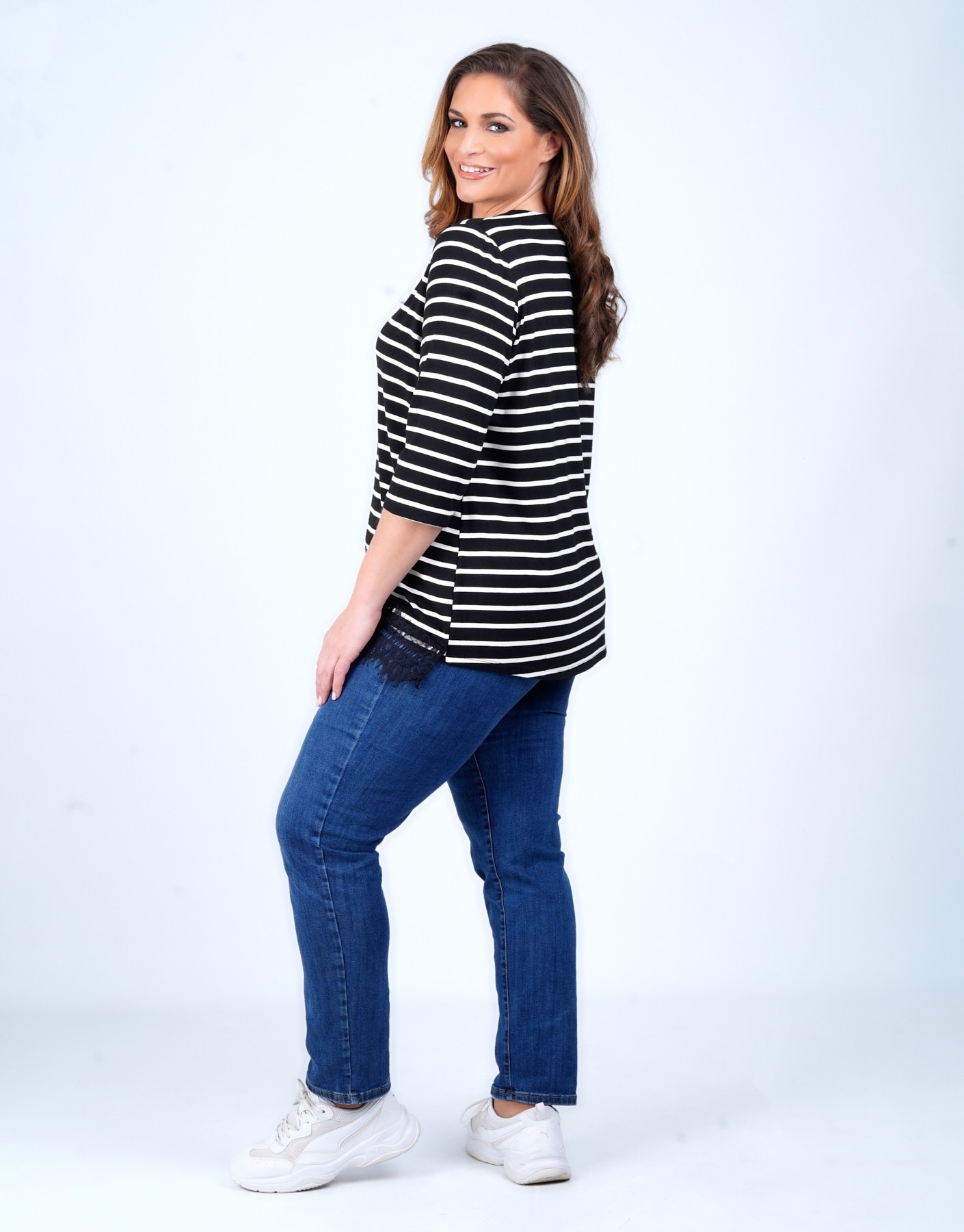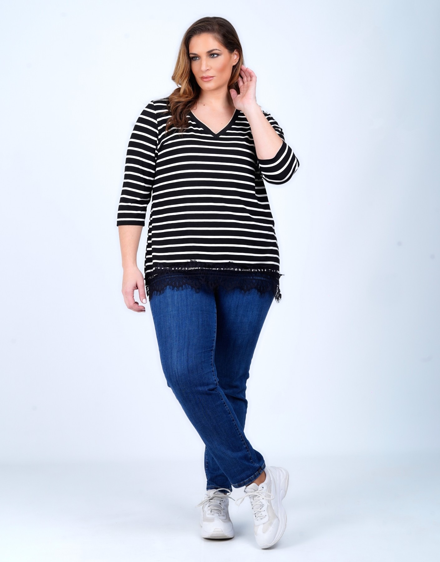 Ριγέ βισκόζ, ελαστική μπλούζα με δαντέλα στο τελείωμα.