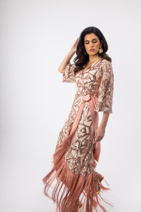 Γυναικείο Maxi Φόρεμα Ροζ Χρυσό διακοσμημένο με παγιέτες & κρόσσια