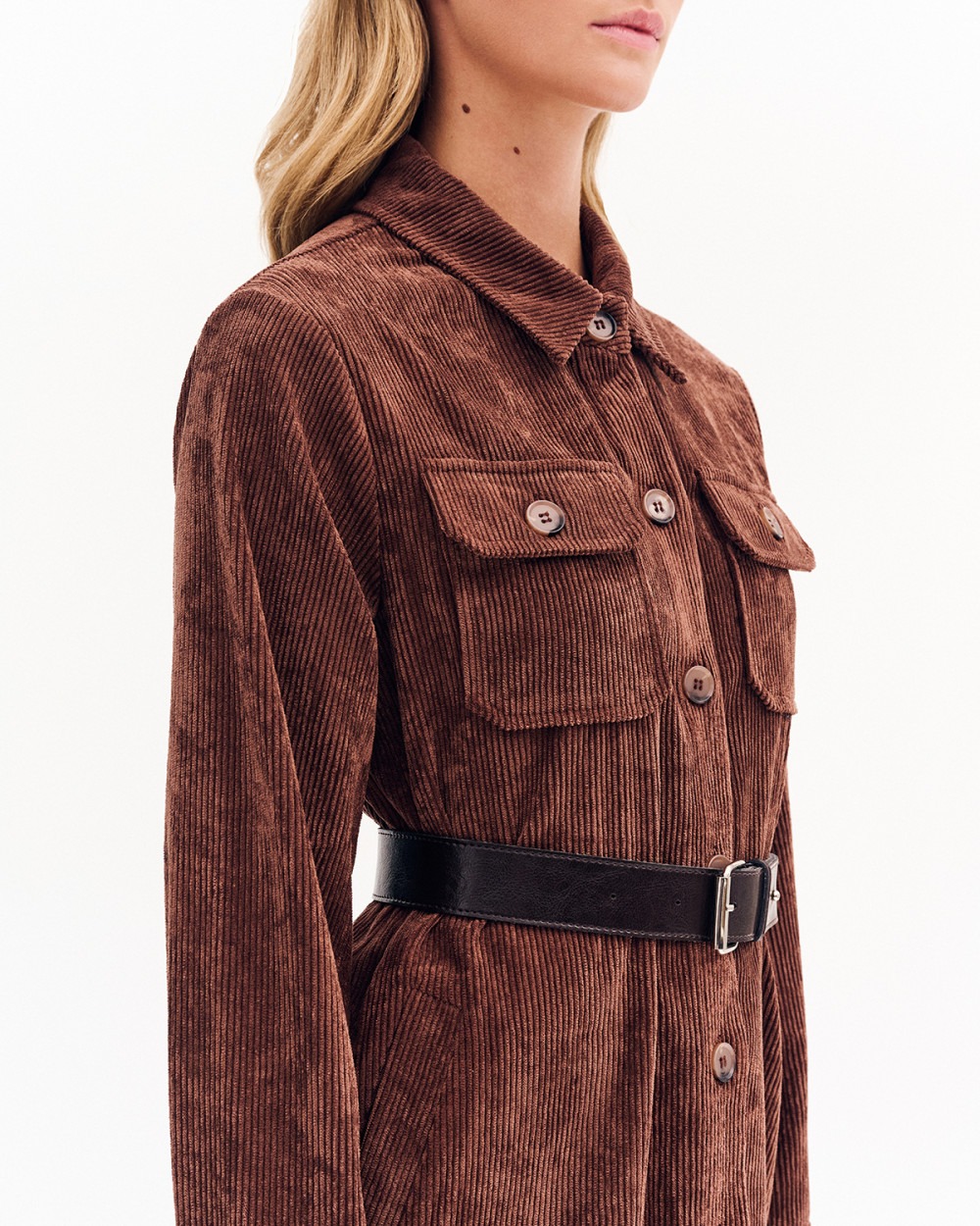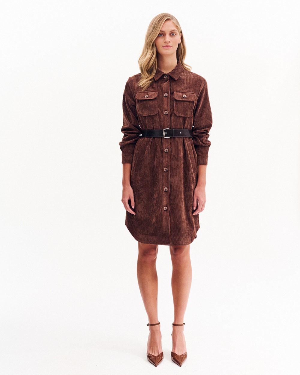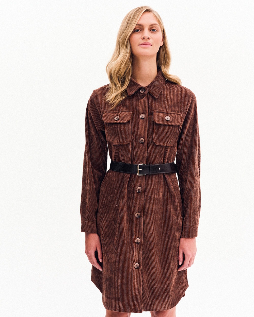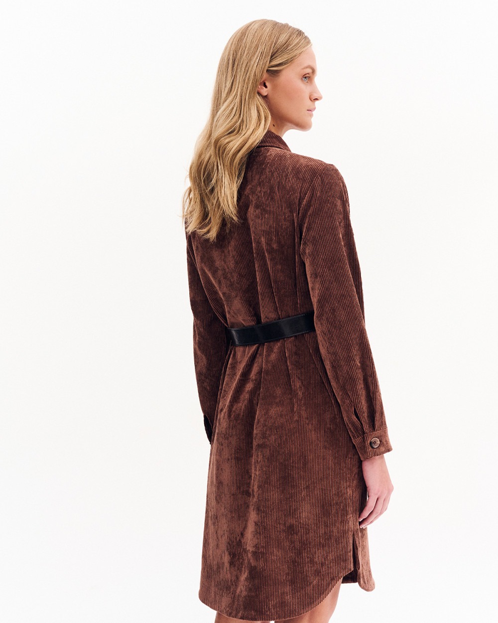 Φόρεμα κοτλέ σεμιζιέ με κλασικό γιακά. Τσέπες με καπάκι και κουμπί στο επάνω μέρος και κοφτές πιο χαμηλά. Μακρύ μανίκι με μανσέτα. Λεπτομέρεια, ζώνη με αγκράφα.