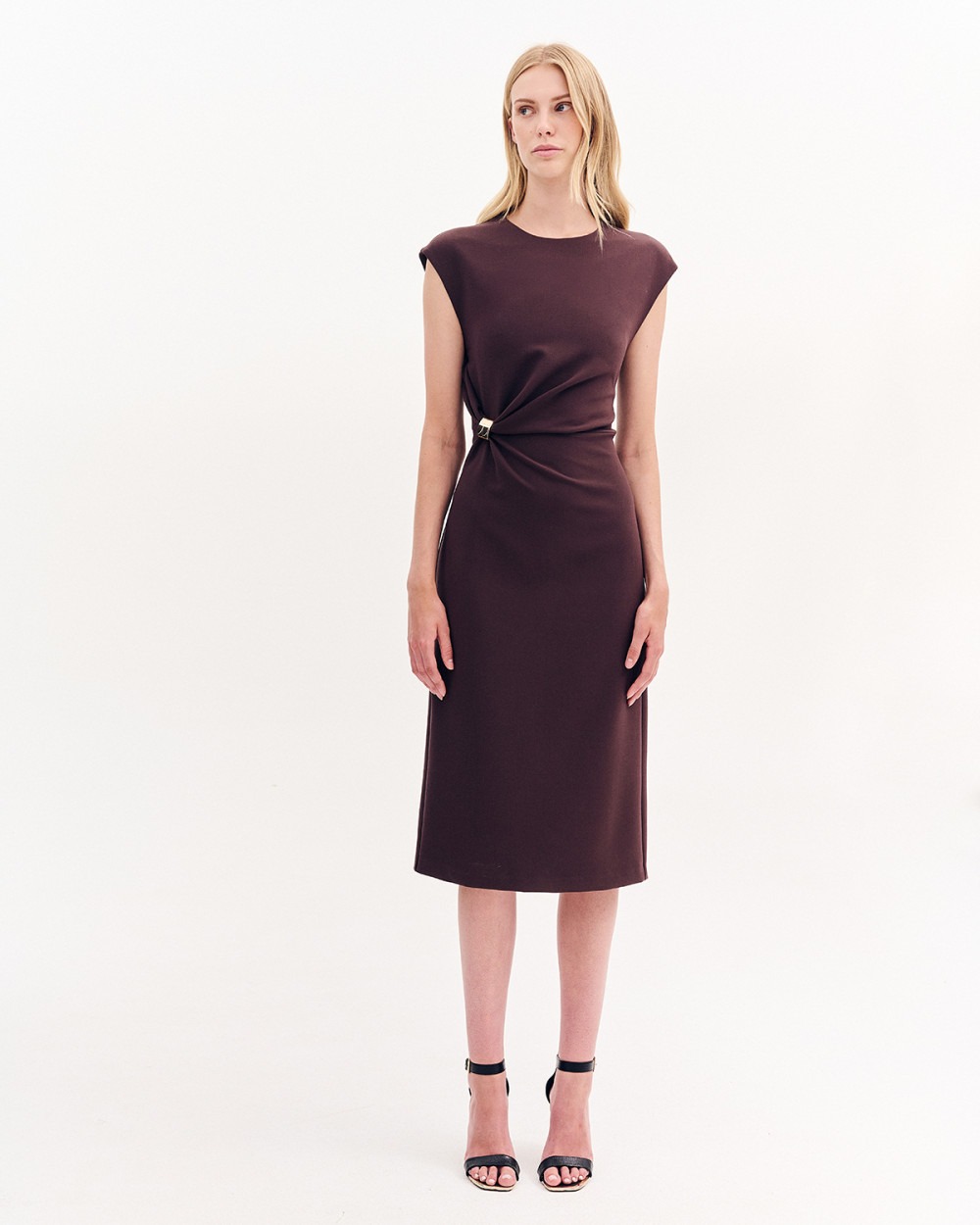 Φόρεμα κρεπ αμάνικο σε pencil γραμμή midi. Με στρογγυλή λαιμόκοψη, κλείσιμο στην πλάτη με κρυφό φερμουάρ και σκίσιμο στο κάτω μέρος. Λεπτομέρεια χρυσού πιασίματος που δημιουργεί ντραπέ στο σημείο της μέσης.
