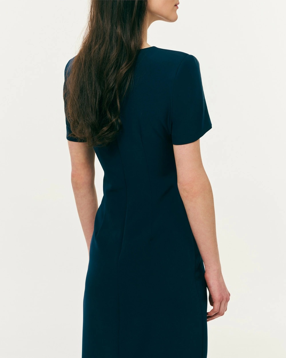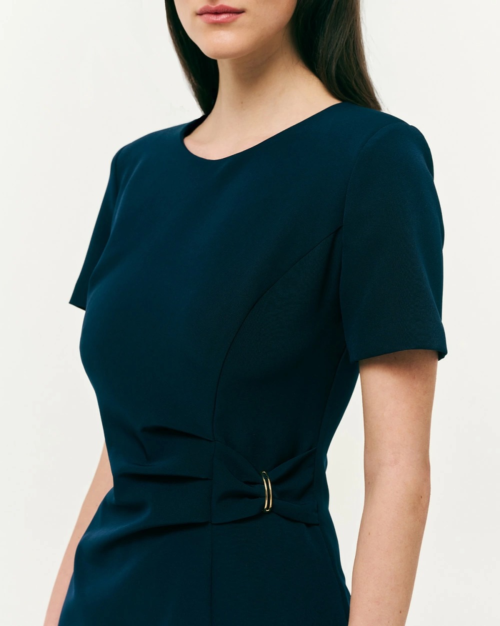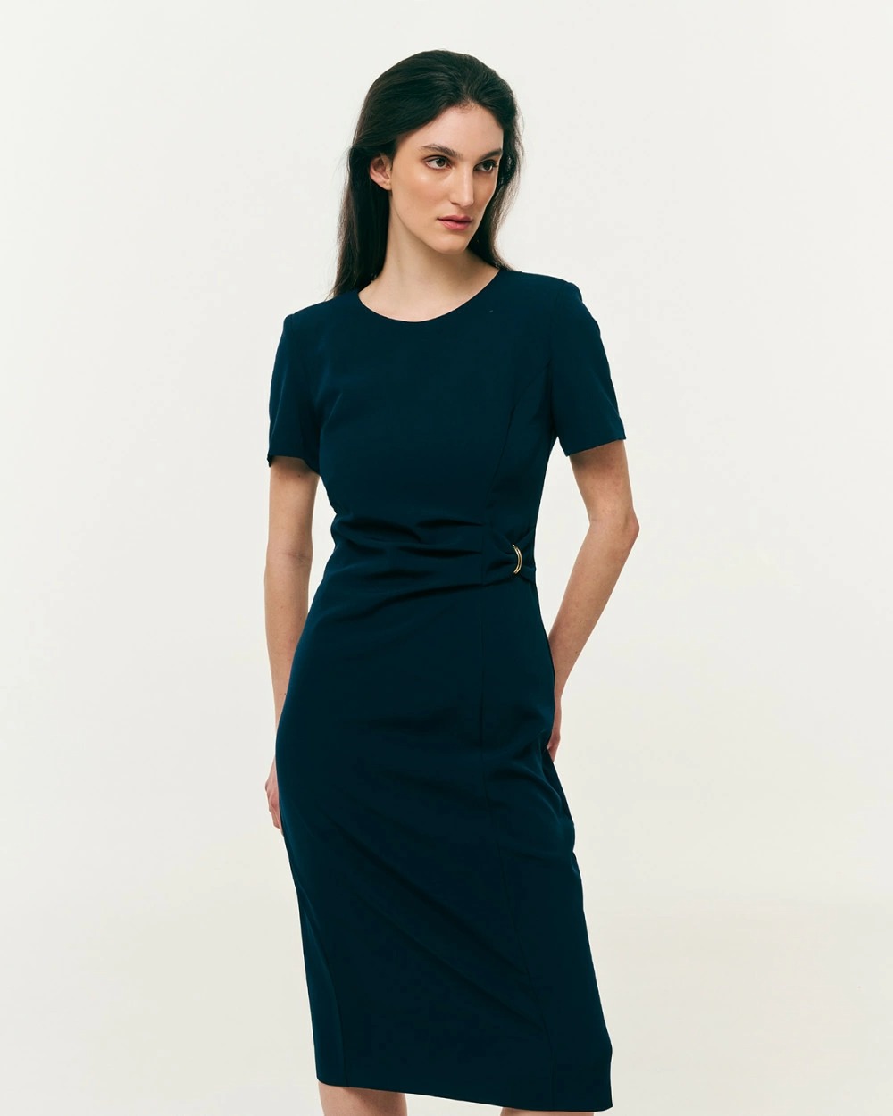 Φόρεμα κρεπ pencil με κοντό μανίκι και στρογγυλή λαιμόκοψη. Πιάσιμο με χρυσό στοιχείο και ντραπέ σχέδιο στη μέση. Κλείσιμο πίσω με κρυφό φερμουάρ.