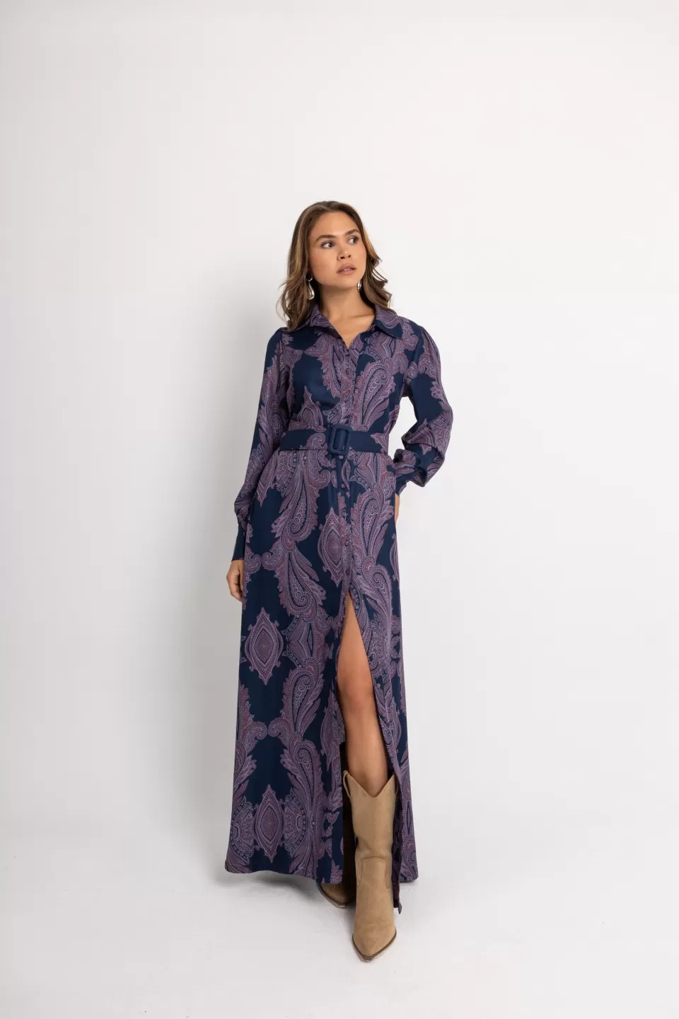 Maxi φόρεμα σε μωβ χρώμα με σχέδια από λαχούρια και ζώνη.