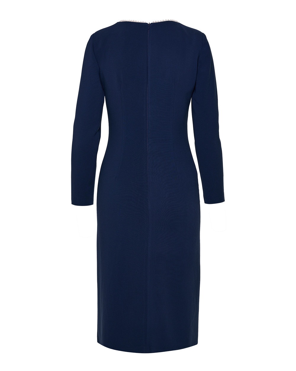 Φόρεμα με πέρλες στη λαιμόκοψη σε pencil γραμμή. Κλείσιμο στη πλάτη με φερμουάρ. Μακριά μανίκια με λεπτομέρεια κουμπιά πέρλες.