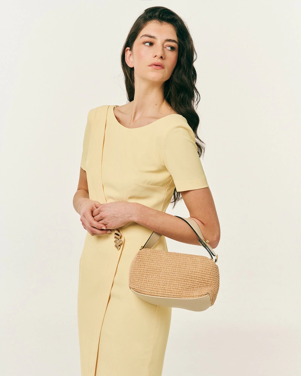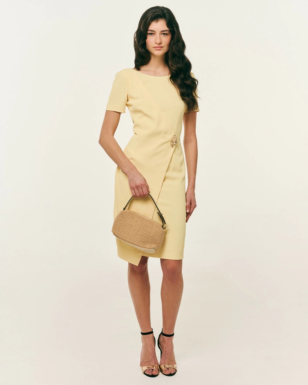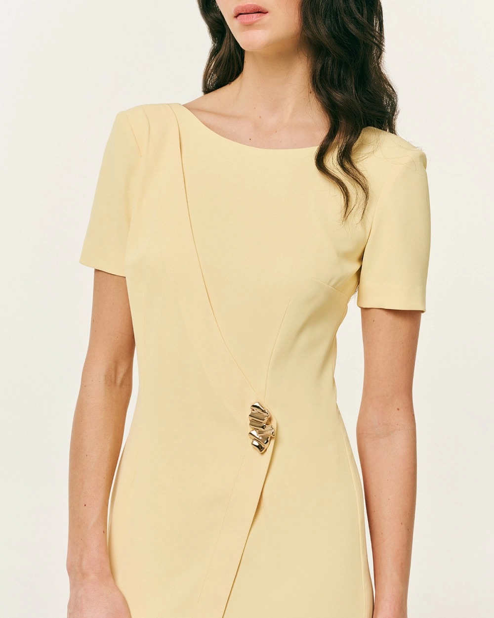 Φόρεμα pencil τύπου φάκελος με πιάσιμο χρυσού στοιχείου στη μία πλευρά. Κοντό μανίκι και στρογγυλή λαιμόκοψη. Σκίσιμο πίσω χαμηλά στα πόδια και κλείσιμο στη πλάτη με κρυφό φερμουάρ.