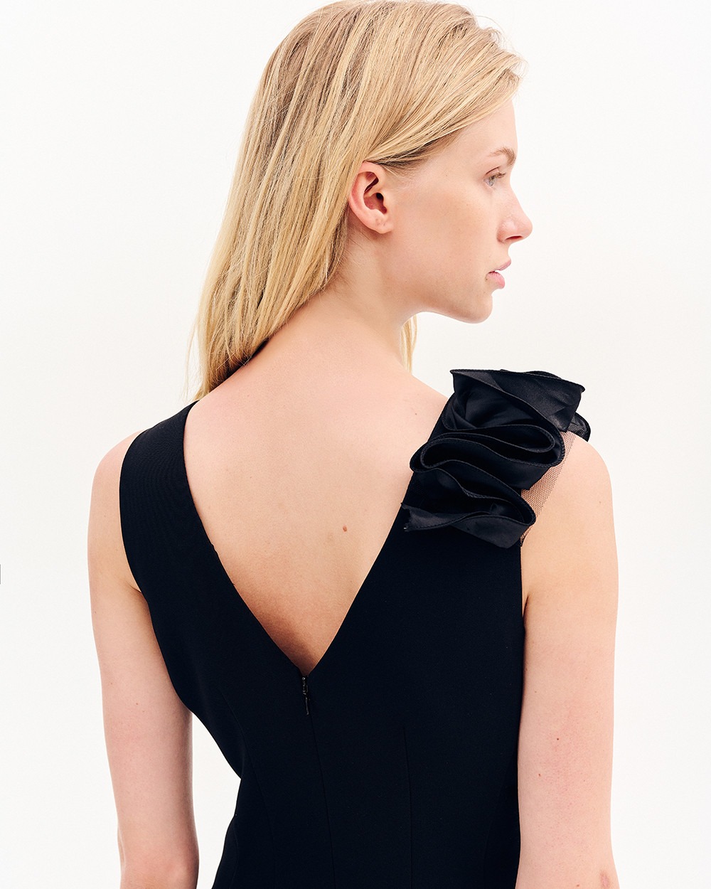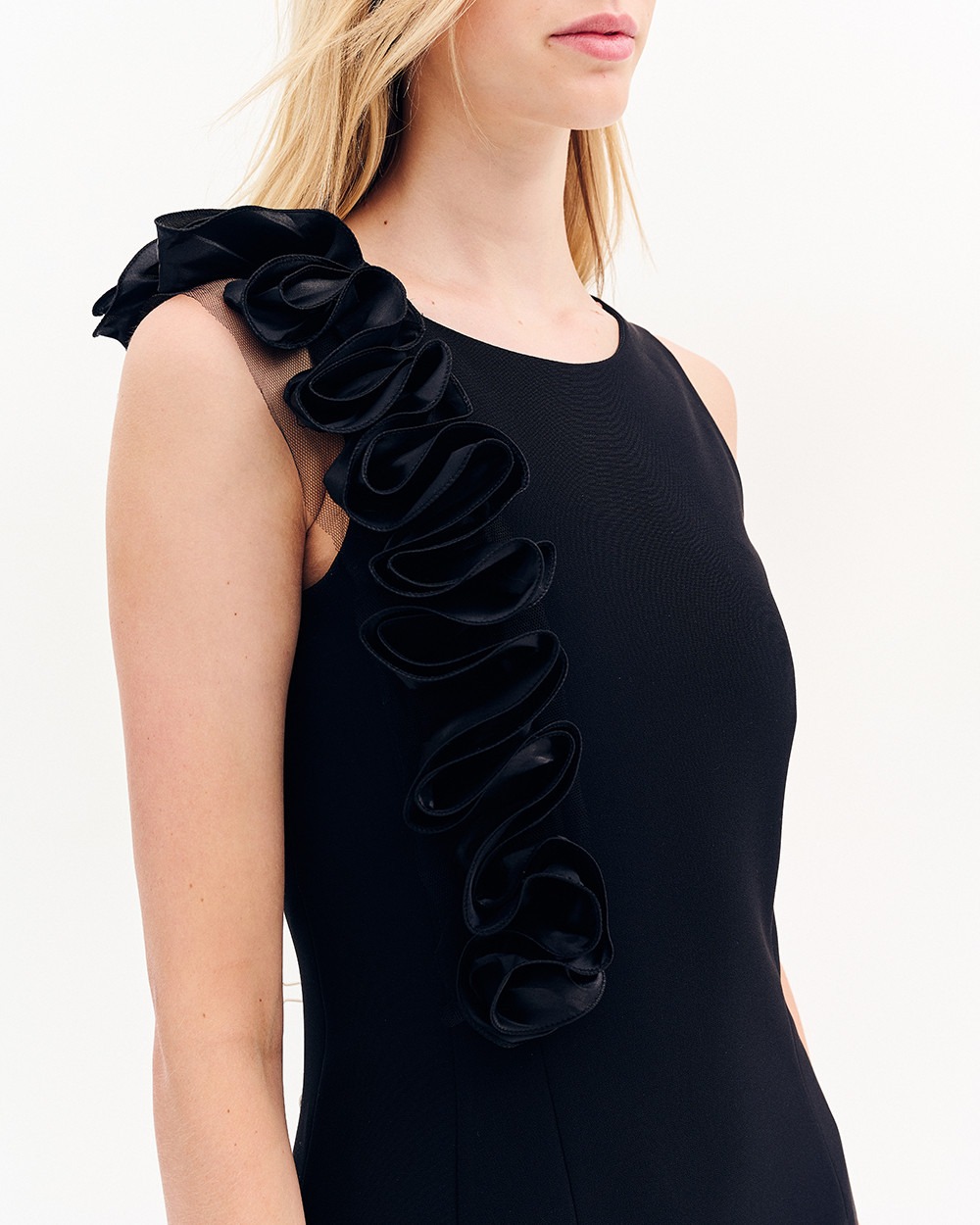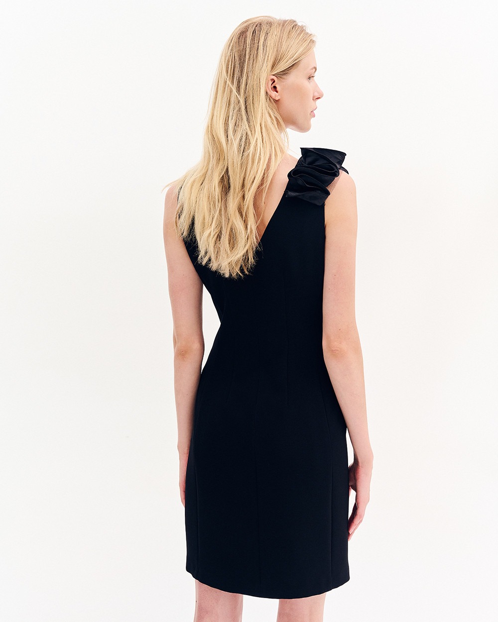 Φόρεμα αμάνικο mini, σε pencil γραμμή. Κρέπ ύφασμα με λεπτομέρεια satin βολάν. Στρογγυλή λαιμόκοψη και V κόψιμο στη πλάτη, κλείσιμο με φερμουάρ.