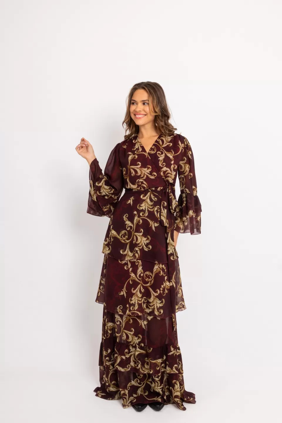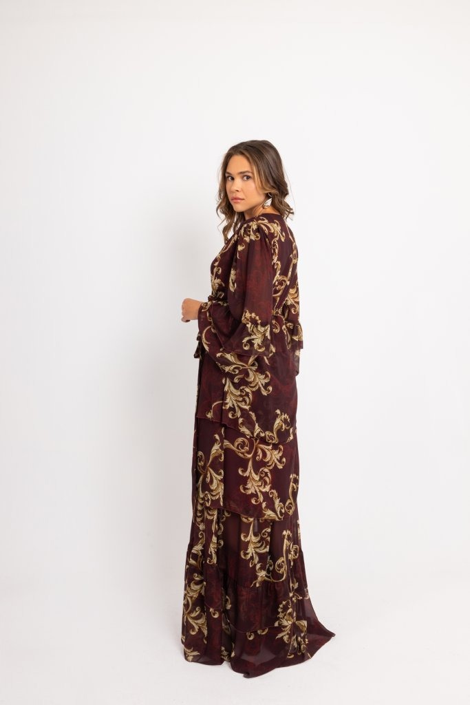 Maxi φόρεμα με εμπριμέ χρυσά σχέδια, βολάν στα μανίκια και δέσιμο στο πλάι σε μπορντώ χρώμα.