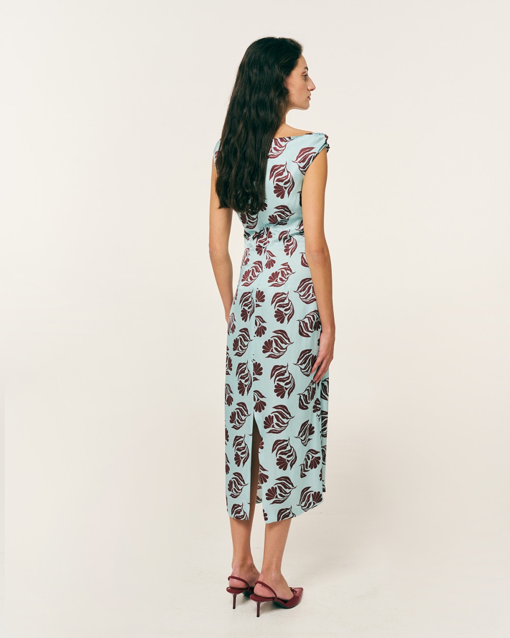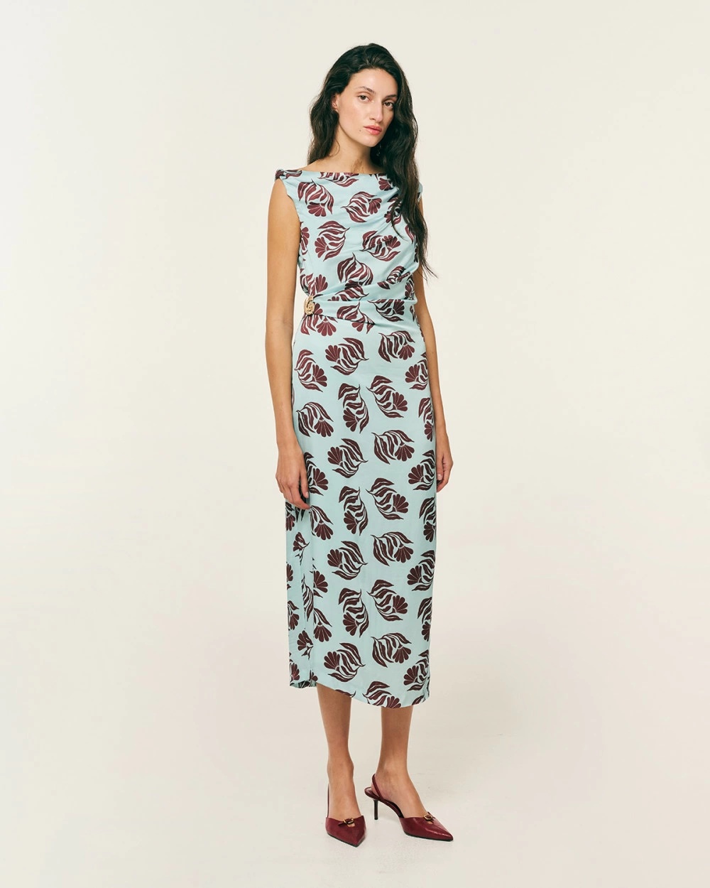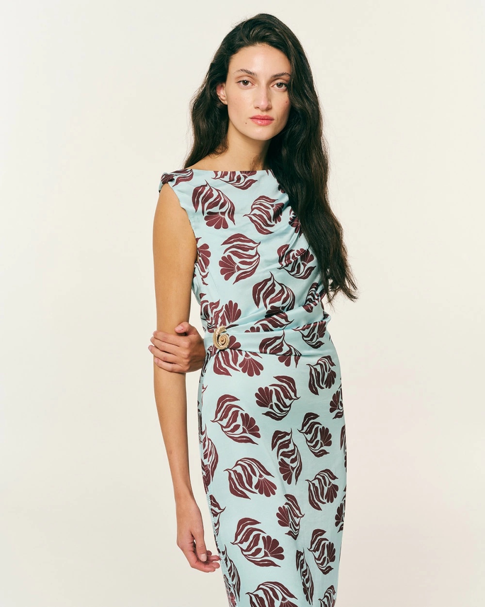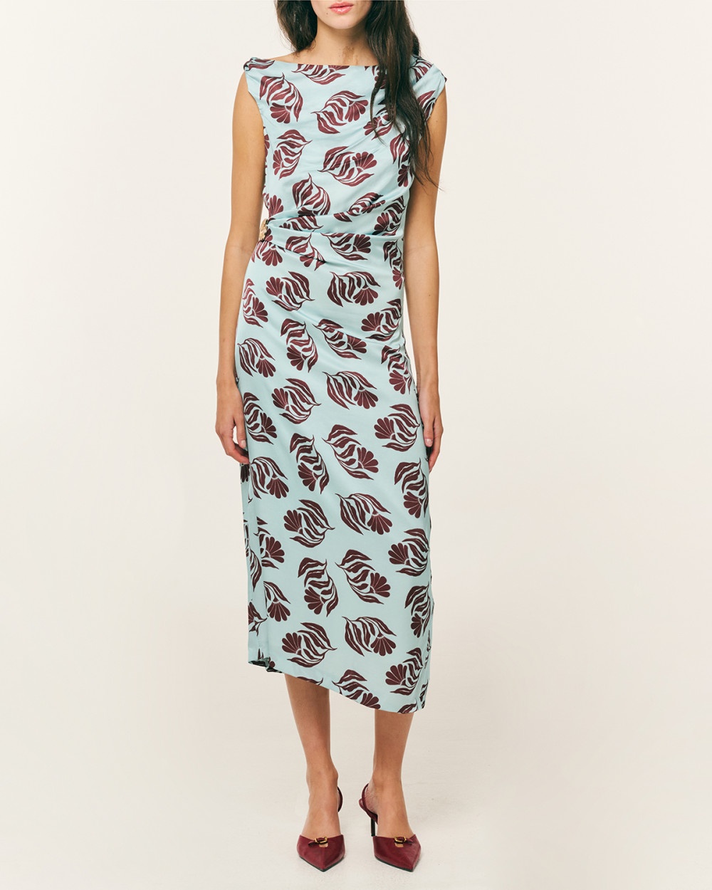 Φόρεμα satin εμπριμέ με ντραπέ στη μέση και χρυσό στοιχείο πιασίματος. Αμάνικο με ντραπέ σχέδιο στον έναν ώμο και γύρισμα στον άλλον. Με οβάλ λαιμόκοψη και σκίσιμο πίσω χαμηλά στα πόδια. Κλείσιμο στη πλάτη με κρυφό φερμουάρ.