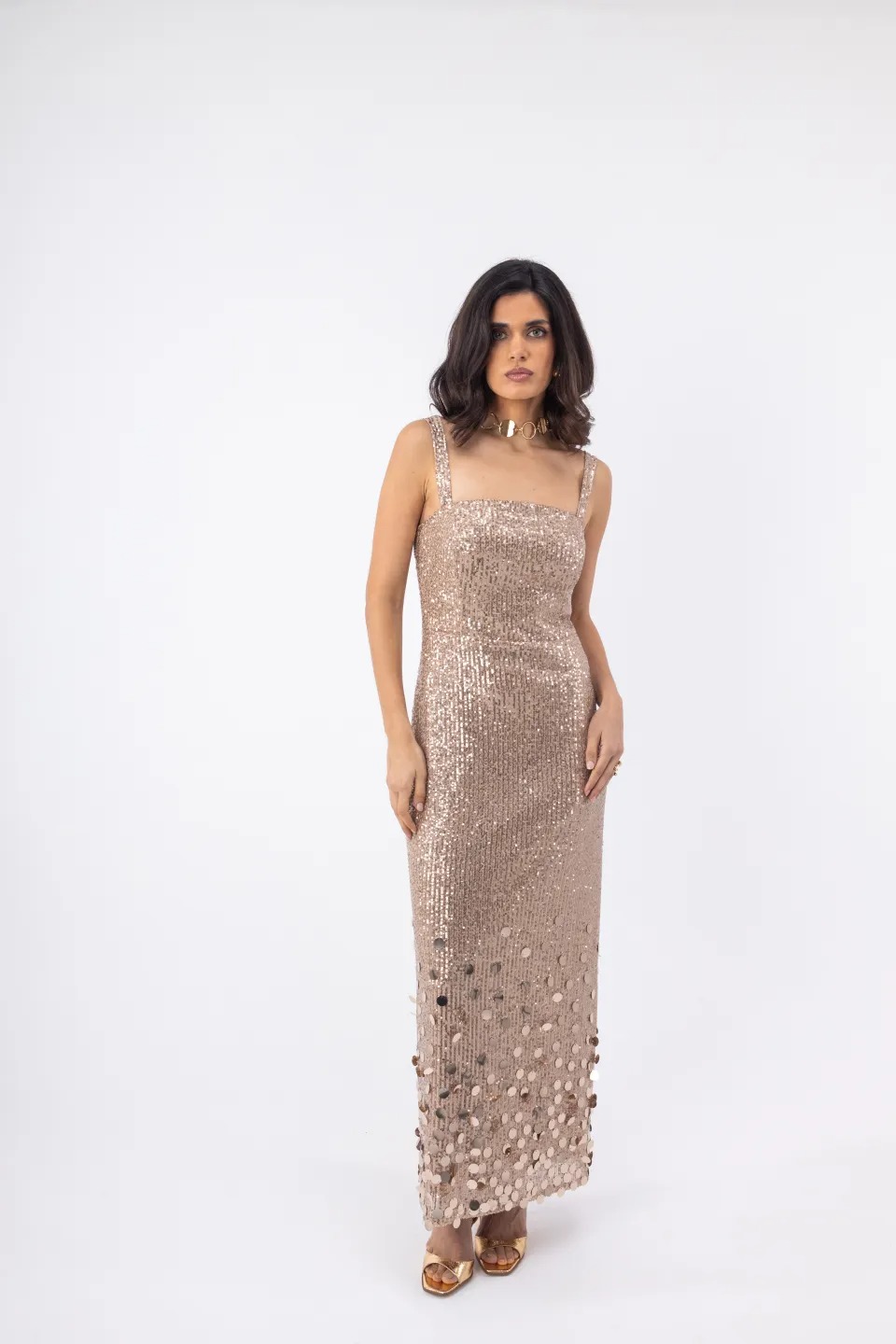 Αναδείξτε τη θηλυκότητα και το σύγχρονο στυλ σας με αυτό το εντυπωσιακό στράπλες μακρύ φόρεμα με παγιέτες σε καφέ χρώμα. Σχεδιασμένο για γυναίκες που αγαπούν τη μοντέρνα κομψότητα, το φόρεμα αγκαλιάζει τη σιλουέτα και χαρίζει μία λαμπερή, elegant εμφάνιση.Οι διακριτικές παγιέτες δημιουργούν ένα εκλεπτυσμένο παιχνίδι λάμψης, ενώ το μακρύ μήκος προσδίδει αέρα πολυτέλειας.