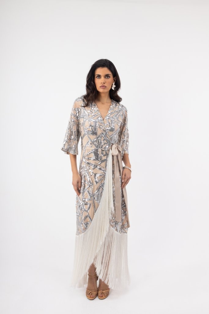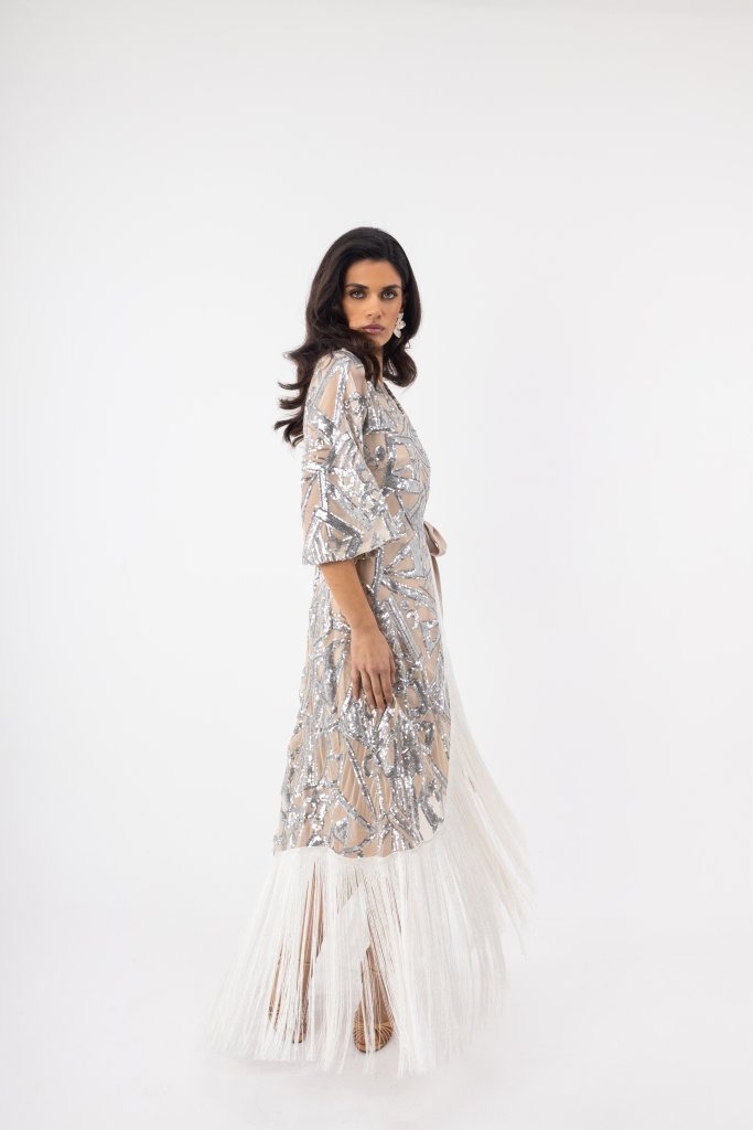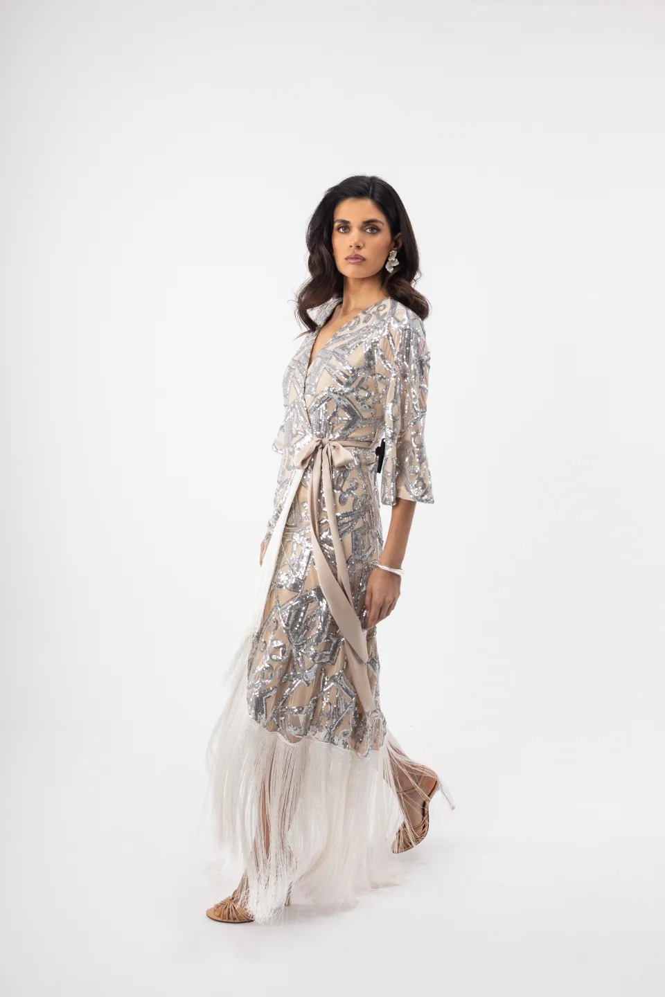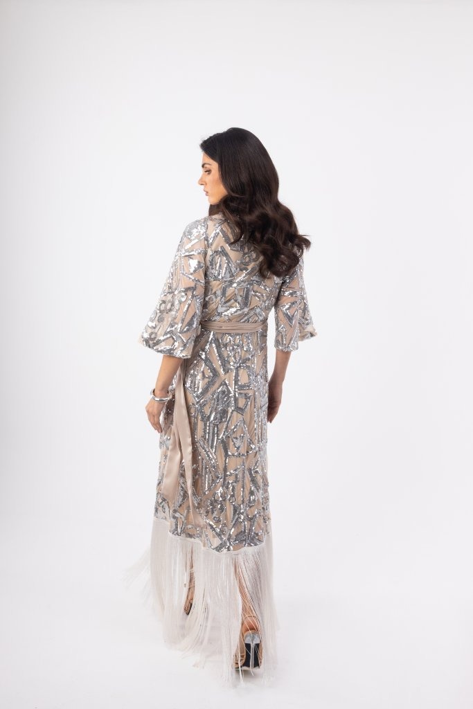 Το Γυναικείο Maxi Φόρεμα Ασημί με Παγίετες, Κρόσσια και Ζώνη είναι η επιτομή της κομψότητας και της βραδινής λάμψης. Η πολυτελής υφή από παγίετες χαρίζει εντυπωσιακό αποτέλεσμα, ενώ τα κρόσσια στο τελείωμα προσθέτουν κίνηση και μοναδικό χαρακτήρα σε κάθε σου βήμα. Η ζώνη στη μέση αναδεικνύει τη σιλουέτα με θηλυκό τρόπο, δημιουργώντας ένα elegant και ισορροπημένο look.