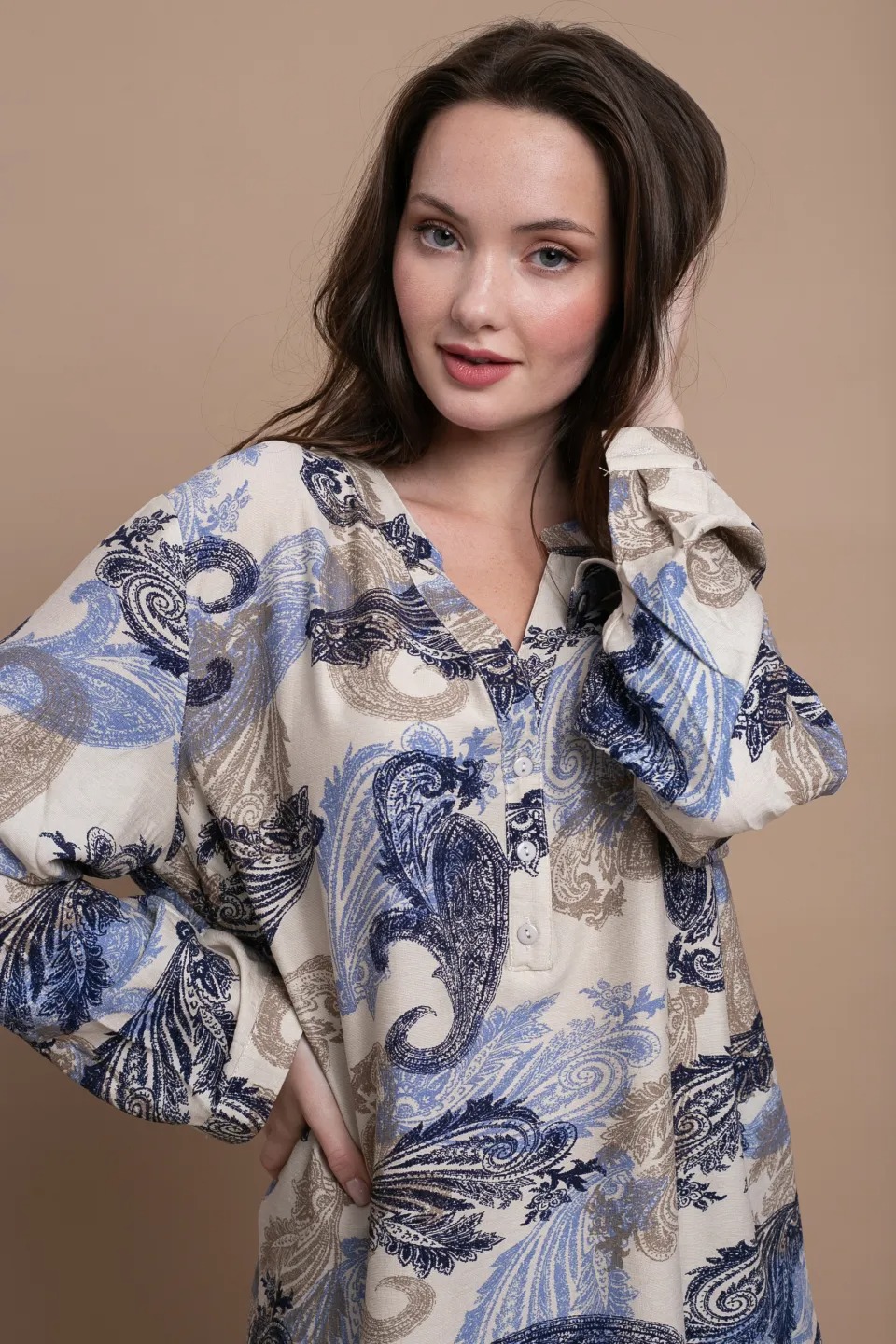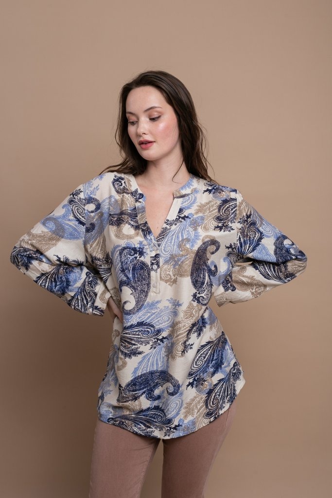 Ανάλαφρο και κομψό πουκάμισο με ιδιαίτερο φλοράλ μοτίβο σε μπλε και γήινες αποχρώσεις, ιδανικό για καθημερινές εμφανίσεις με στυλ. Διαθέτει άνετη γραμμή που χαρίζει ελευθερία κινήσεων και κομψή εφαρμογή, ενώ η διακριτική λαιμόκοψη με κουμπιά στο μπροστινό μέρος προσθέτει μια μοντέρνα και θηλυκή πινελιά στο σχέδιο.