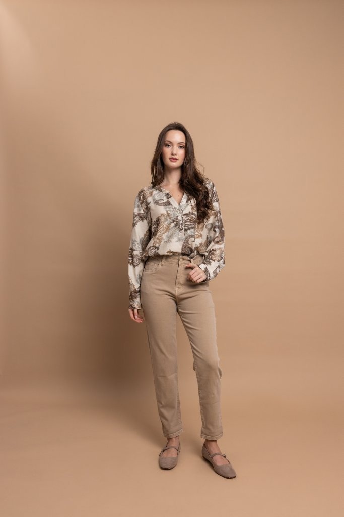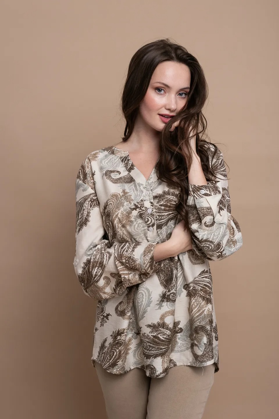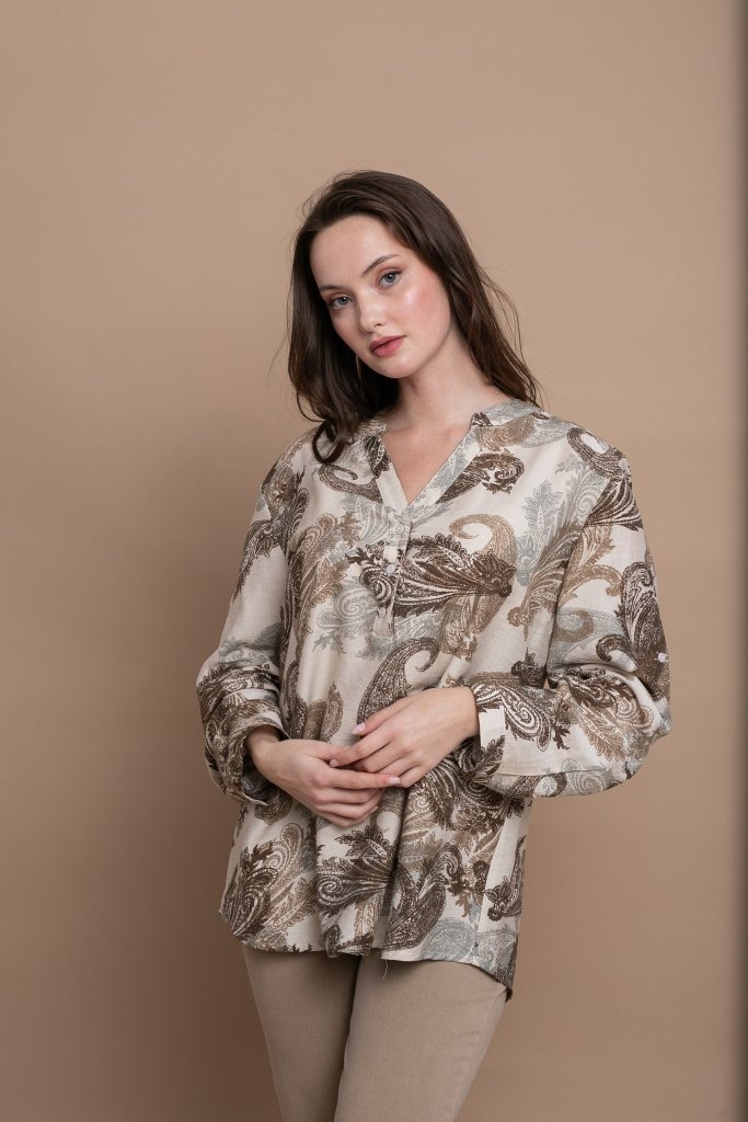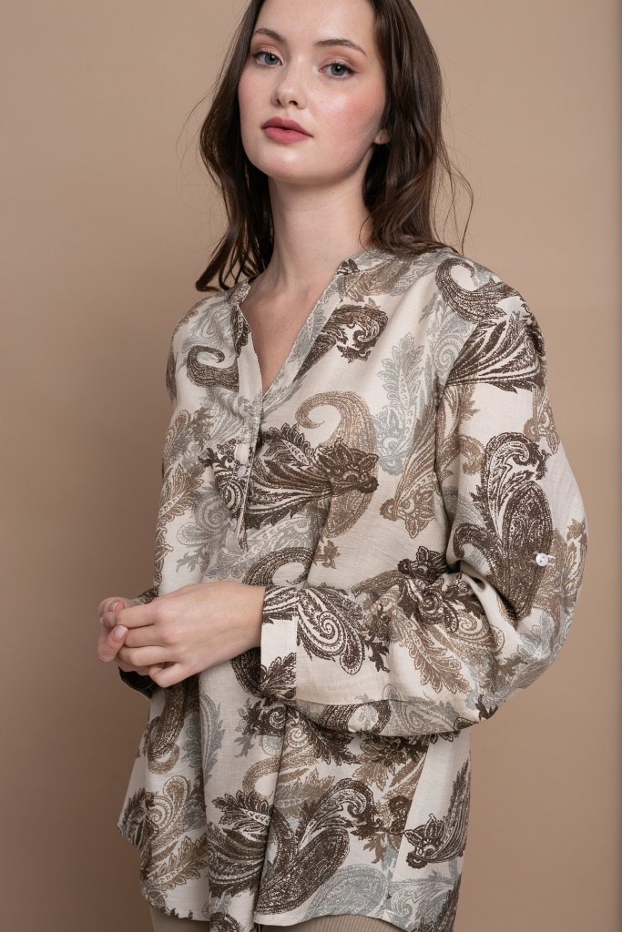Ανάλαφρο και κομψό πουκάμισο με ιδιαίτερο φλοράλ μοτίβο σε καφέ και γήινες αποχρώσεις, ιδανικό για καθημερινές εμφανίσεις με στυλ. Διαθέτει άνετη γραμμή που χαρίζει ελευθερία κινήσεων και κομψή εφαρμογή, ενώ η διακριτική λαιμόκοψη με κουμπιά στο μπροστινό μέρος προσθέτει μια μοντέρνα και θηλυκή πινελιά στο σχέδιο.