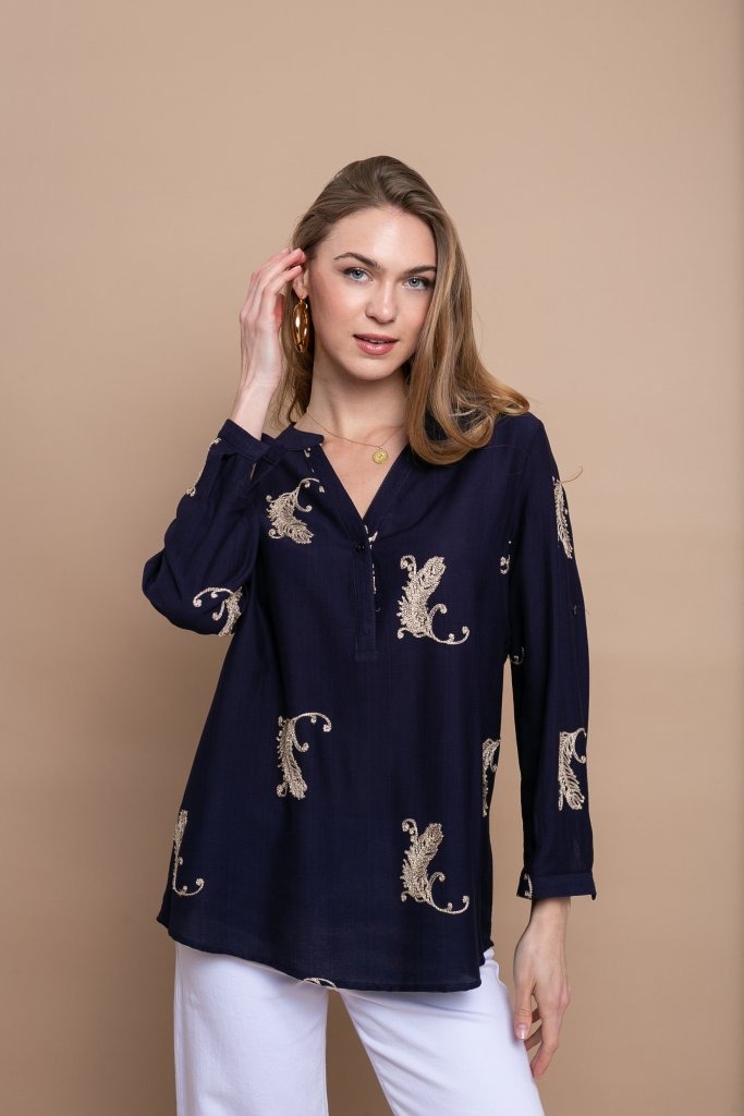 Μια εντυπωσιακή γυναικεία μπλούζα σε σκούρο μπλε χρώμα που ξεχωρίζει χάρη στα διακριτικά μοτίβα με λαχούρια. Η άνετη γραμμή της χαρίζει ελευθερία κινήσεων και κομψότητα, ενώ το ελαφρύ ύφασμα την κάνει ιδανική για καθημερινή χρήση από το πρωί μέχρι το βράδυ.