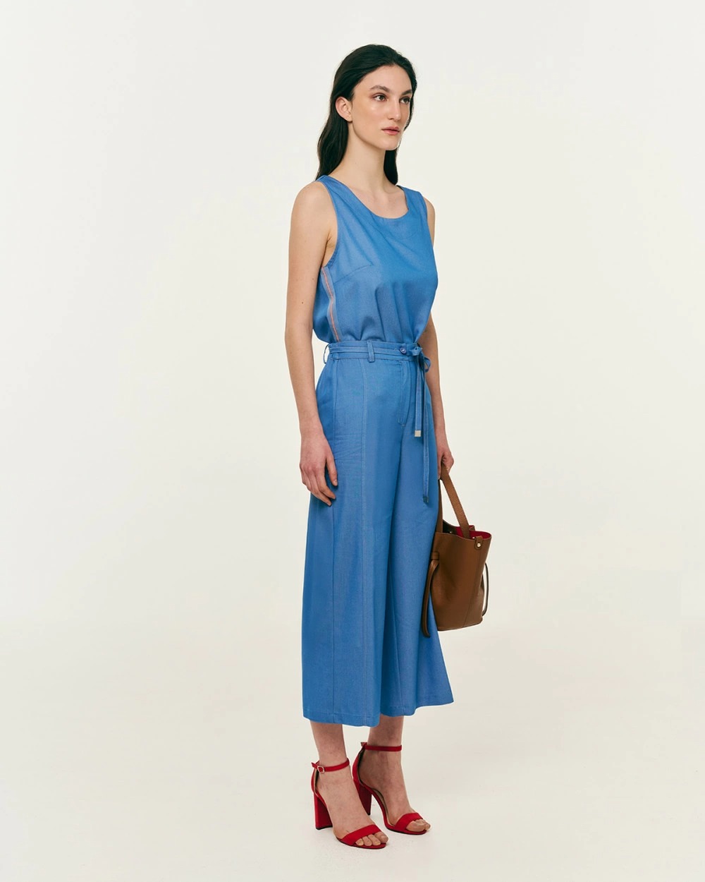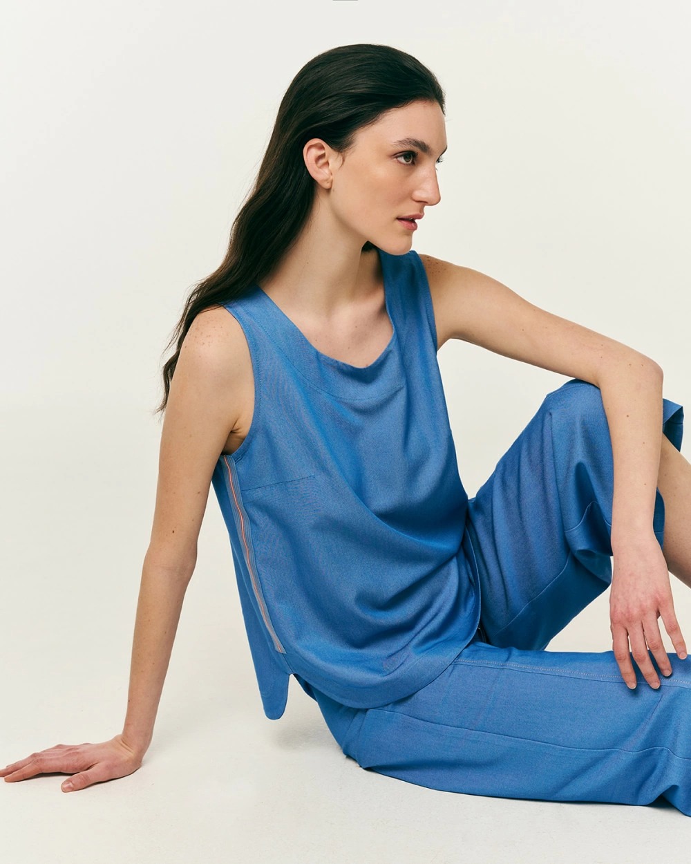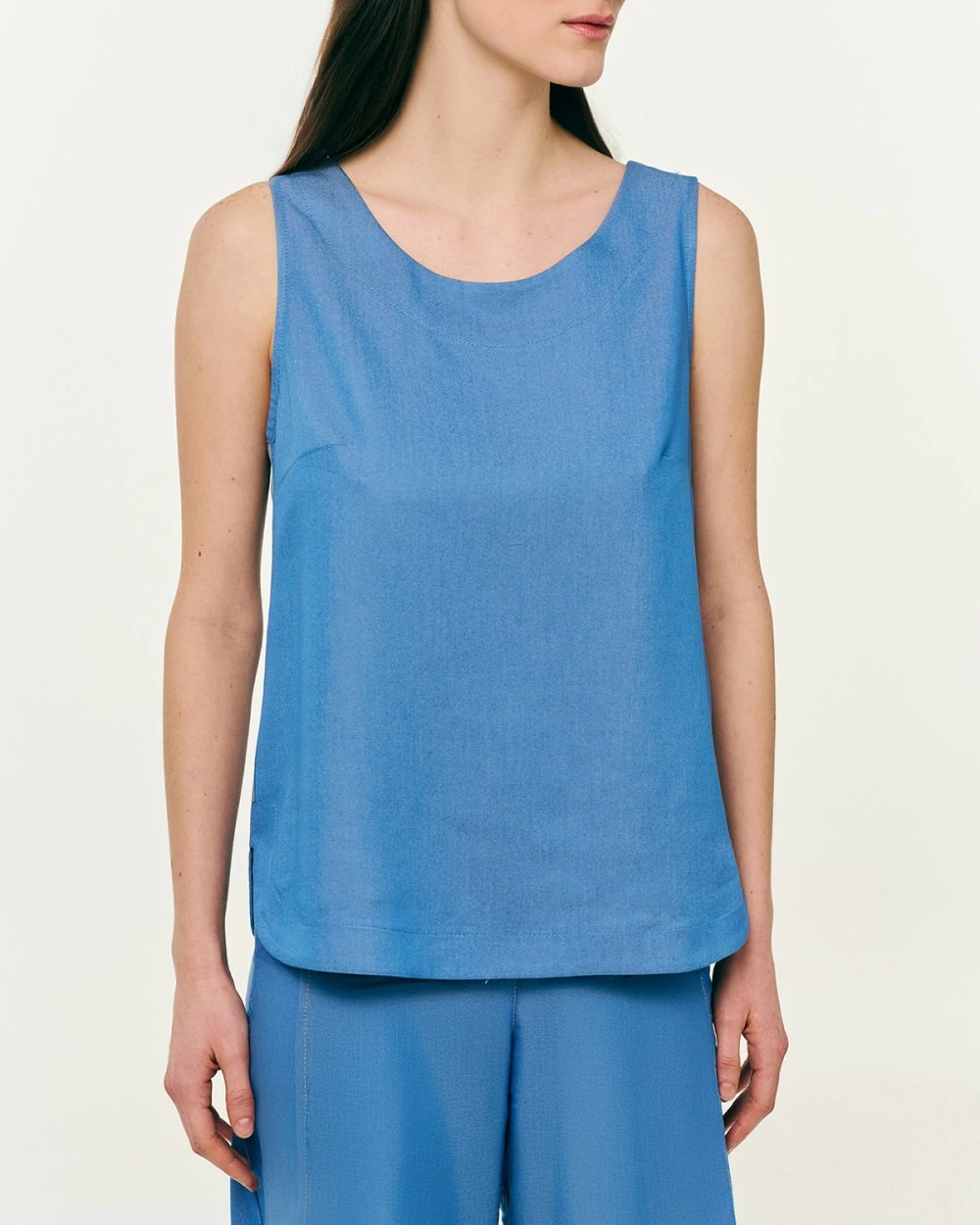 Μπλούζα αμάνικη σε τζιν ύφος, με μείγμα βισκόζης. Στρογγυλή λαιμόκοψη, λεπτομέρεια, ρέλι στα πλαϊνά και σκίσιμο στο τελείωμα.