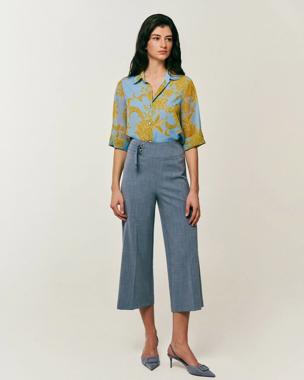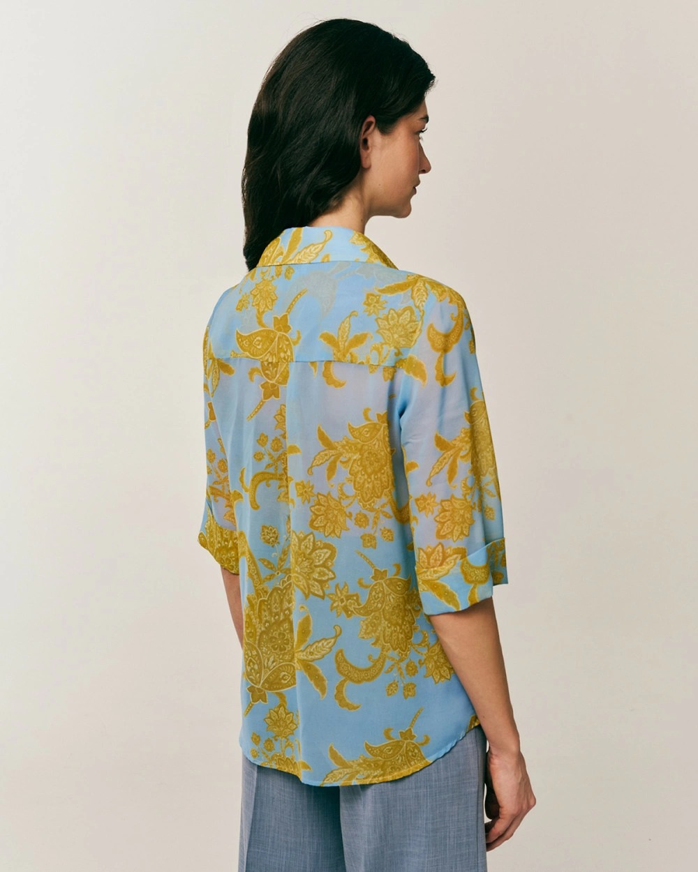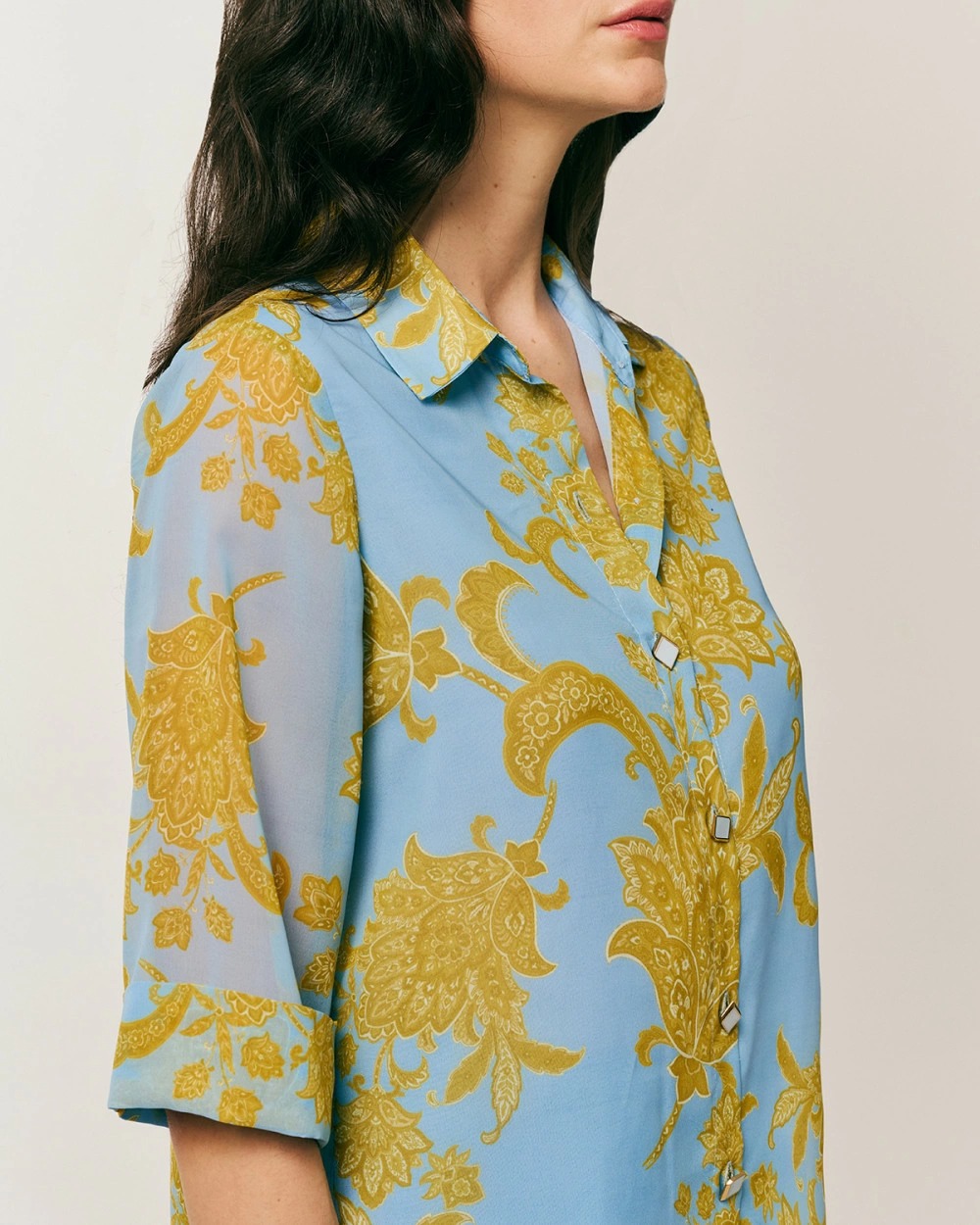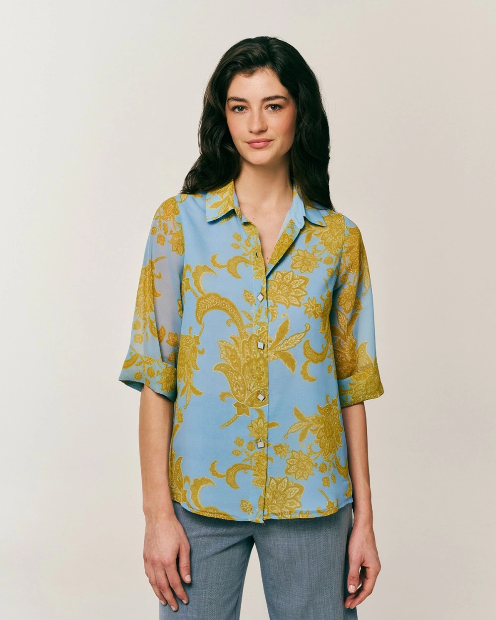 Πουκάμισο εμπριμέ με μανίκια 3/4. Κλασικός γιακάς, κλείσιμο μπροστά με ιδιαίτερα κουμπιά.