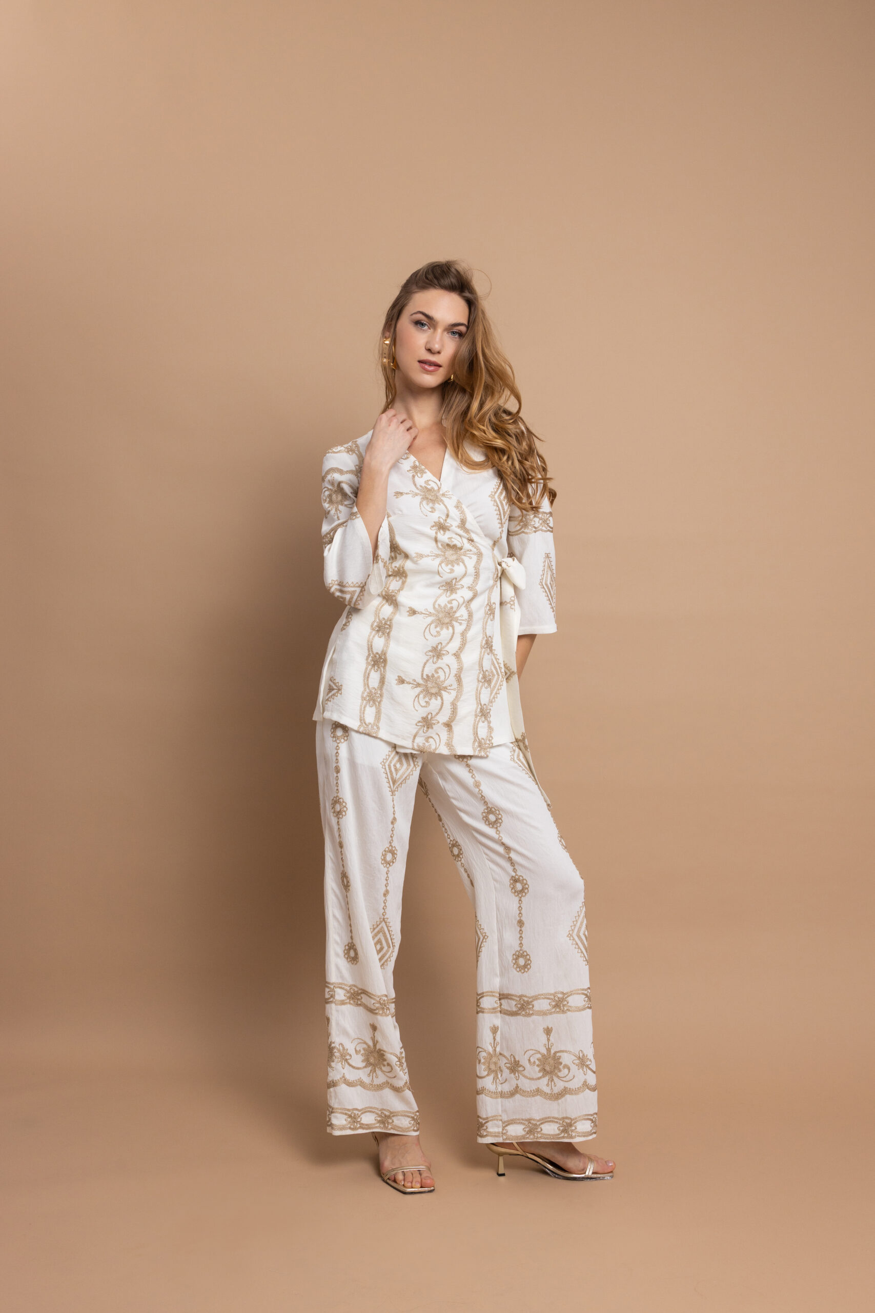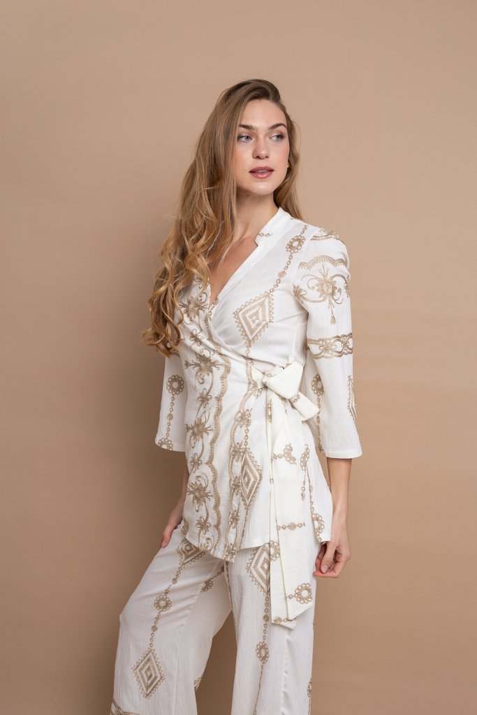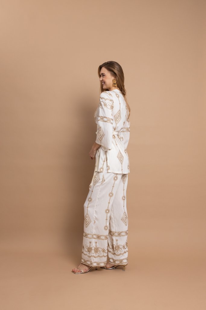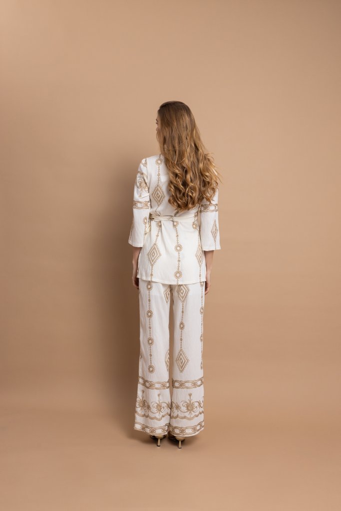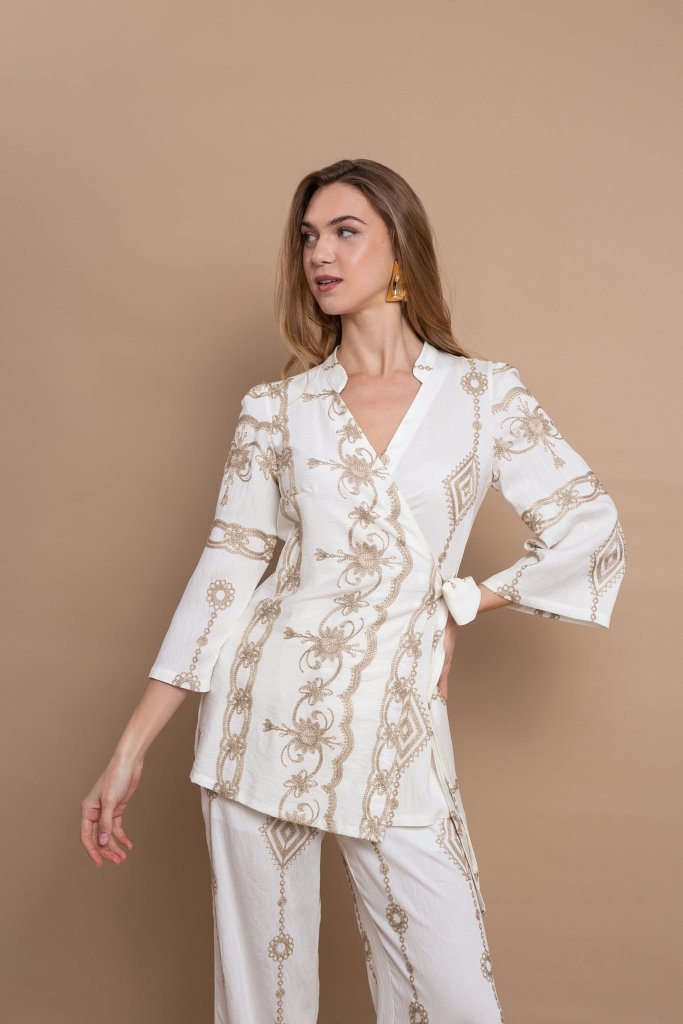 Γιατί ξεχωρίζει αυτό το σχέδιο Ο συνδυασμός της εκρού βάσης με τα χρυσά μοτίβα δημιουργεί ένα αποτέλεσμα που αποπνέει κομψότητα και πολυτέλεια χωρίς υπερβολές. Η σταυρωτή μπλούζα κολακεύει τη σιλουέτα, ενώ το αέρινο παντελόνι χαρίζει άνεση και κομψότητα, δημιουργώντας ένα σύνολο που τραβά διακριτικά τα βλέμματα.